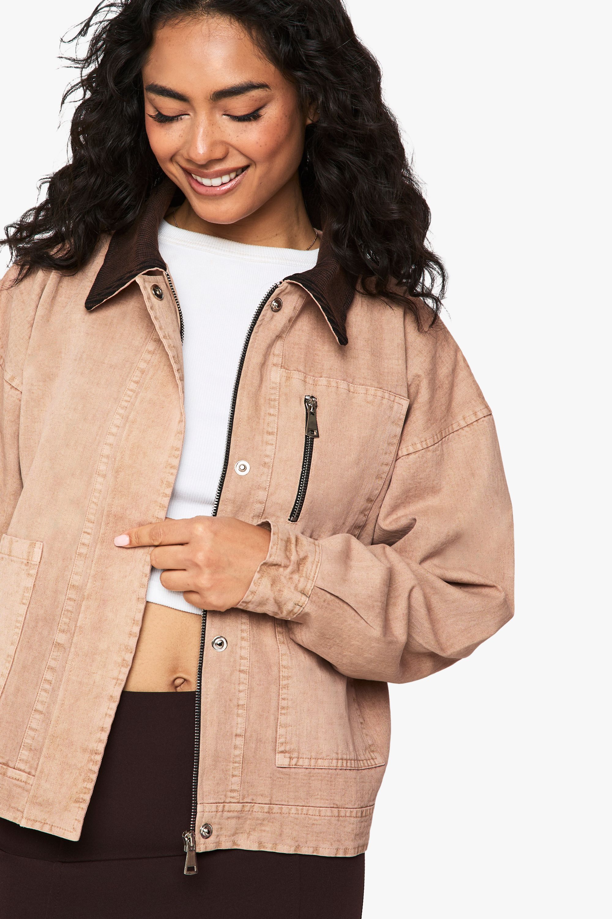 - Oversized barn jacket with distinctive contrast collar for a contemporary twist