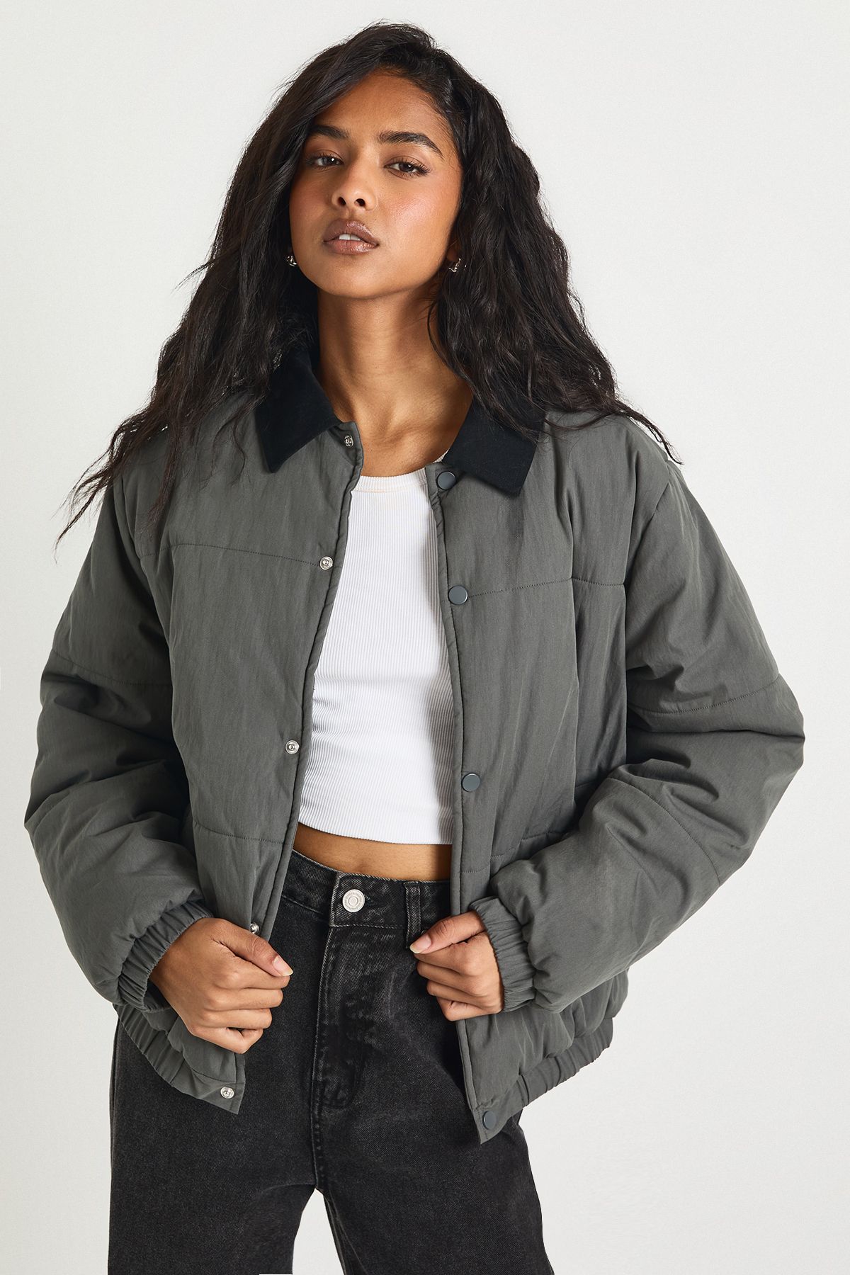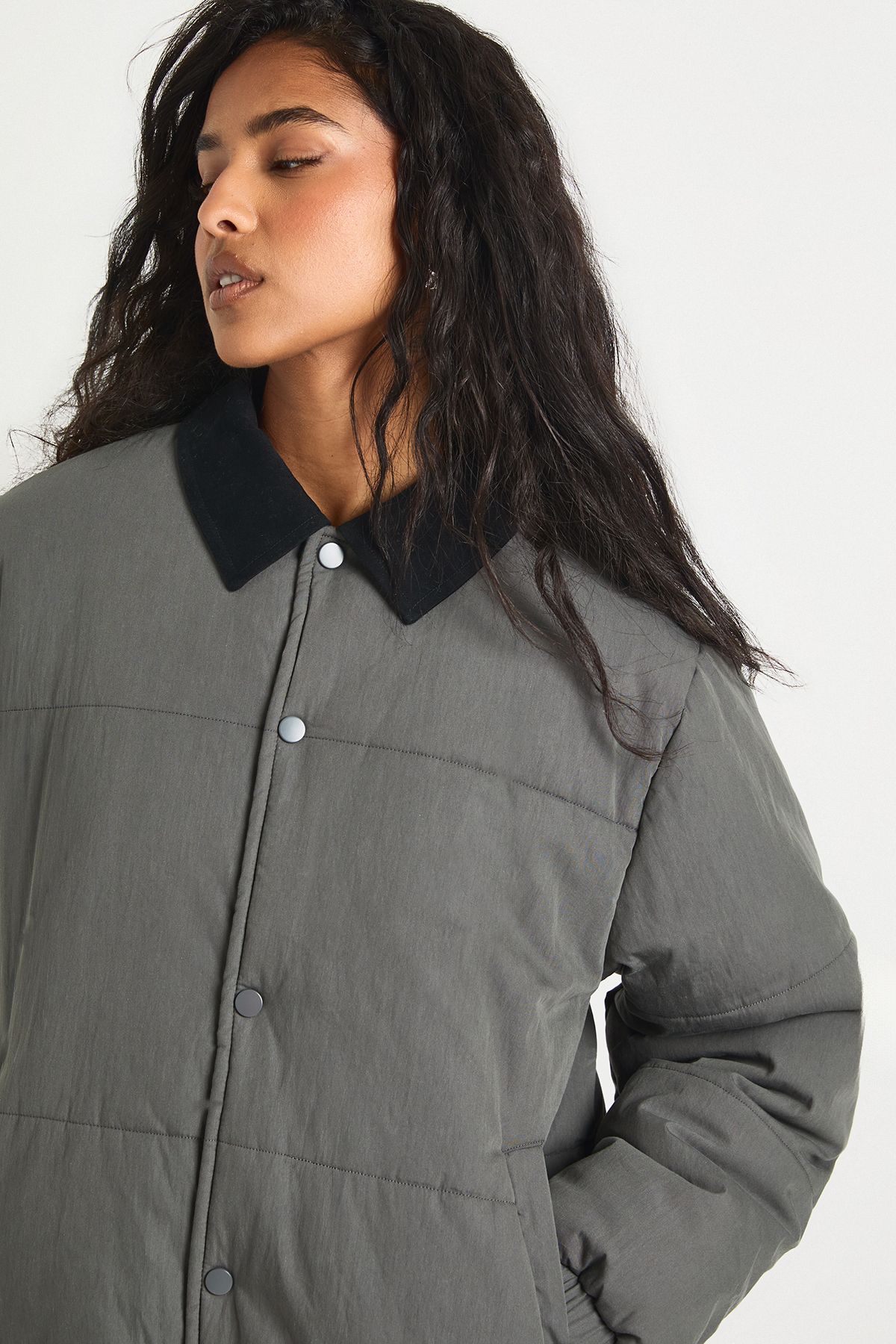 - This Contrast Collar Peached Padded Jacket from boohoo combines practicality with street-style appeal. The distinctive contrast collar creates a striking focal point, whilst the relaxed fit allows for comfortable layering over your favourite basics. Style as seen with a simple crop top and high-waisted jeans for an effortlessly cool daytime look, or throw over a hoodie when temperatures drop. The versatile design makes it ideal for casual outings, weekend brunches or laid-back evening gatherings. The quilted construction offers welcome warmth without compromising on style, whilst the button-through fastening allows you to customise your level of coverage. This jacket is the perfect addition to your casual wardrobe, offering that coveted blend of functionality and fashion-forward design that boohoo is known for.