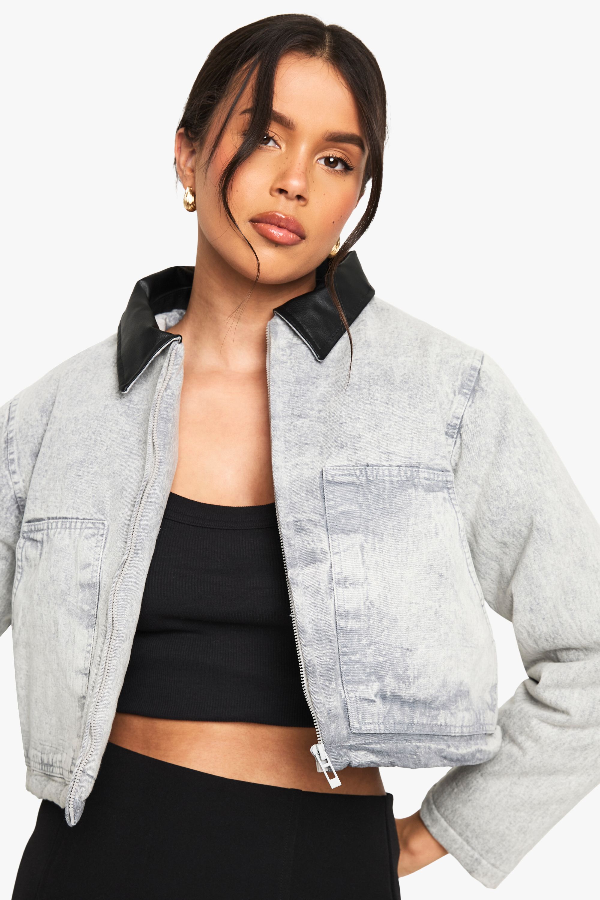 - Versatile cotton fabric for comfort Make a bold statement with this eye-catching jacket featuring a distinctive contrast collar. The cropped length adds a contemporary edge to your ensemble, perfect for the fashion-forward trendsetter. Pair it with high-waisted trousers and trainers for a casual day out, or dress it up with a midi skirt and ankle boots for a chic evening look. The relaxed fit ensures comfort without compromising on style, making it ideal for various casual occasions from coffee dates to family gatherings. The zip-front closure allows for easy layering, while the cotton fabric offers breathability and softness against the skin. This jacket is a versatile piece that will quickly become a go-to in your wardrobe, effortlessly blending comfort with on-trend design for the Boohoo girl who loves to stay ahead of the fashion curve.