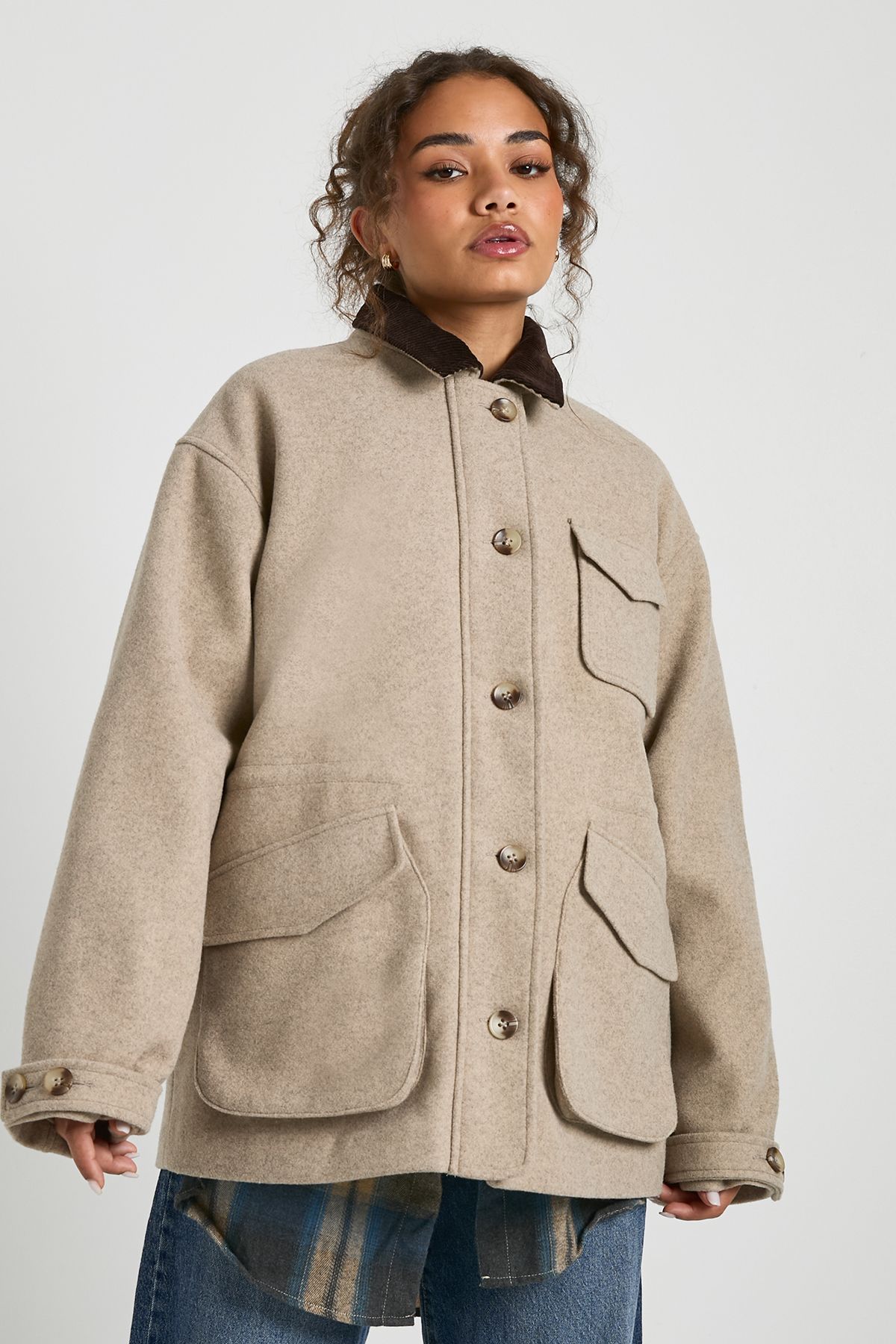 - This contrast collar shacket combines the structure of a jacket with the casual comfort of a shirt, making it an essential addition to your autumn-winter wardrobe. The relaxed, oversized fit allows for effortless layering over jumpers and tees, while the multiple utility pockets add practical functionality to its contemporary design. Style with wide-leg jeans and a striped knit as shown for casual weekend outings, or pair with a checked shirt peeking underneath for added dimension. Perfect for family gatherings or coffee dates with friends, this versatile piece transitions seamlessly from day to evening. For a more polished look, cinch the waist with a belt and team with straight-leg trousers and chunky boots. The wool-look texture offers warmth without bulk, making this Boohoo shacket a go-to option for the fashion-forward woman seeking both comfort and style.