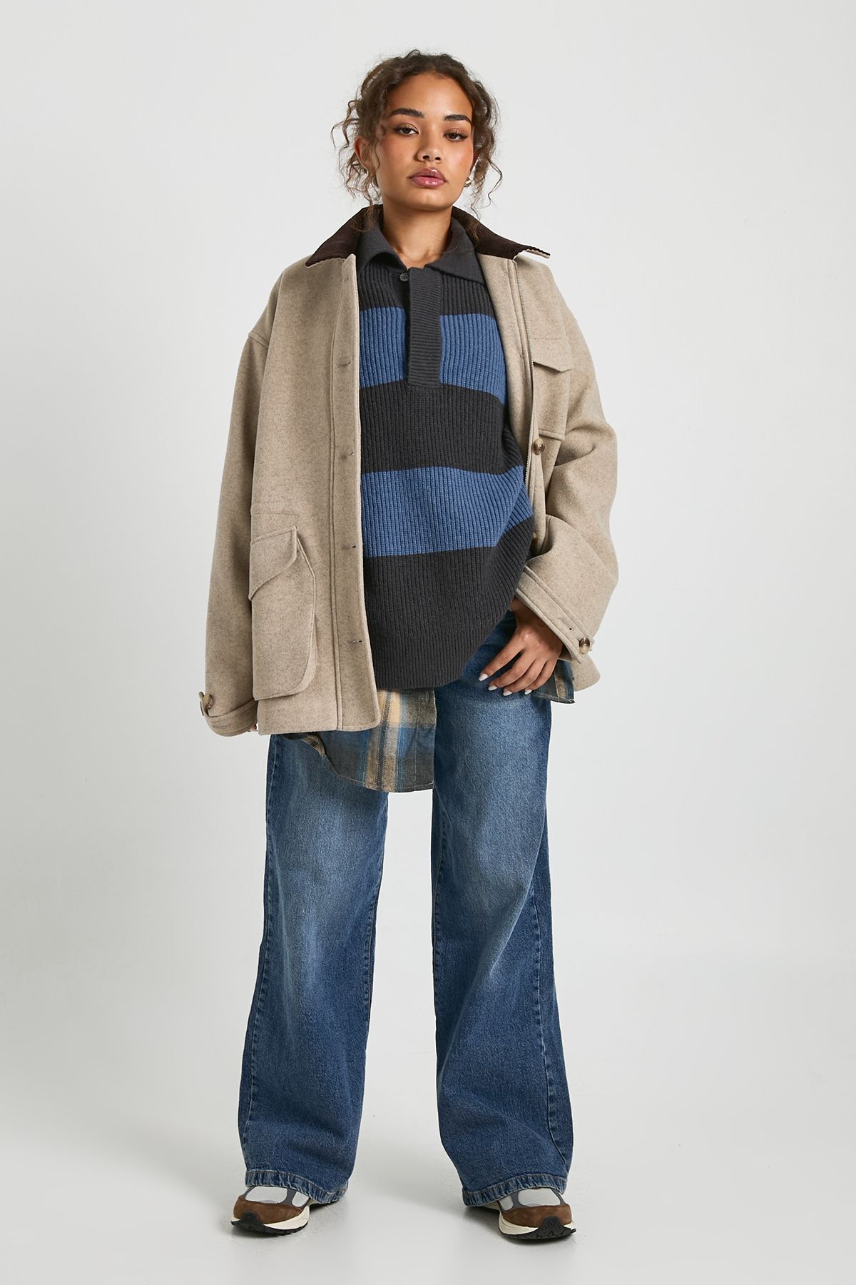 - Soft wool-look fabric creates a cosy yet stylish outer layer This contrast collar shacket combines the structure of a jacket with the casual comfort of a shirt, making it an essential addition to your autumn-winter wardrobe. The relaxed, oversized fit allows for effortless layering over jumpers and tees, while the multiple utility pockets add practical functionality to its contemporary design. Style with wide-leg jeans and a striped knit as shown for casual weekend outings, or pair with a checked shirt peeking underneath for added dimension. Perfect for family gatherings or coffee dates with friends, this versatile piece transitions seamlessly from day to evening. For a more polished look, cinch the waist with a belt and team with straight-leg trousers and chunky boots. The wool-look texture offers warmth without bulk, making this Boohoo shacket a go-to option for the fashion-forward woman seeking both comfort and style.