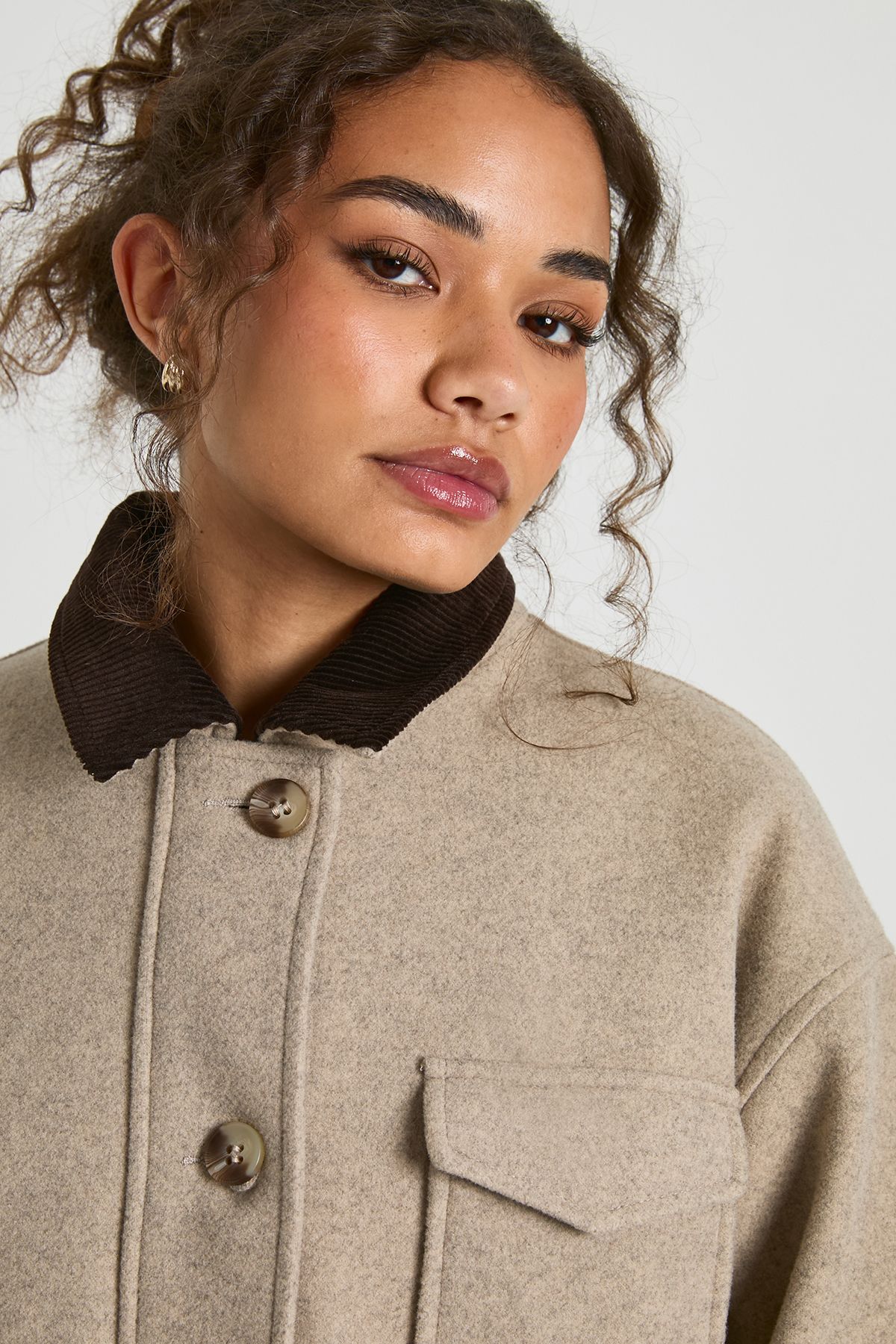 - Contrast collar design adds a distinctive touch to this wool-look shacket