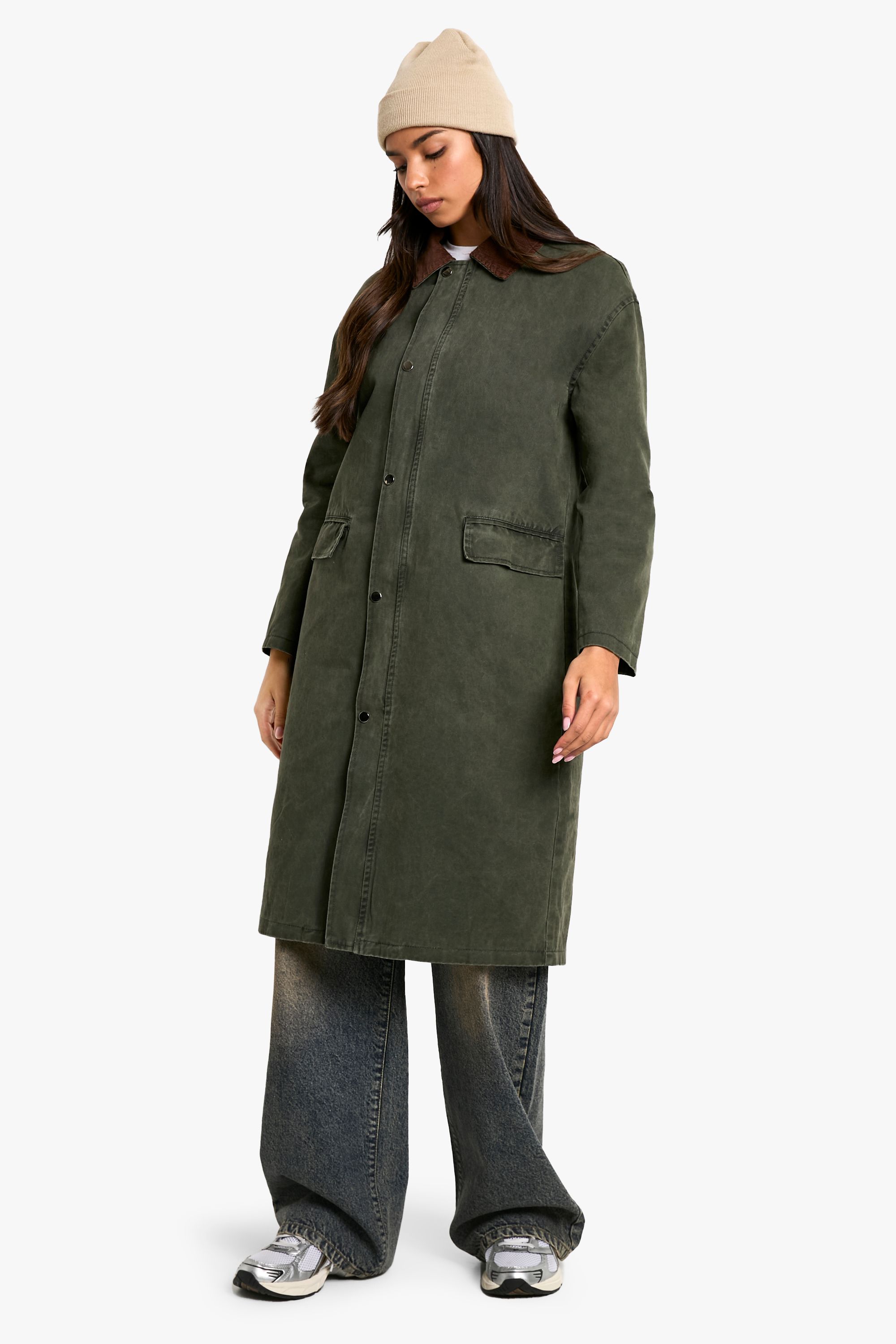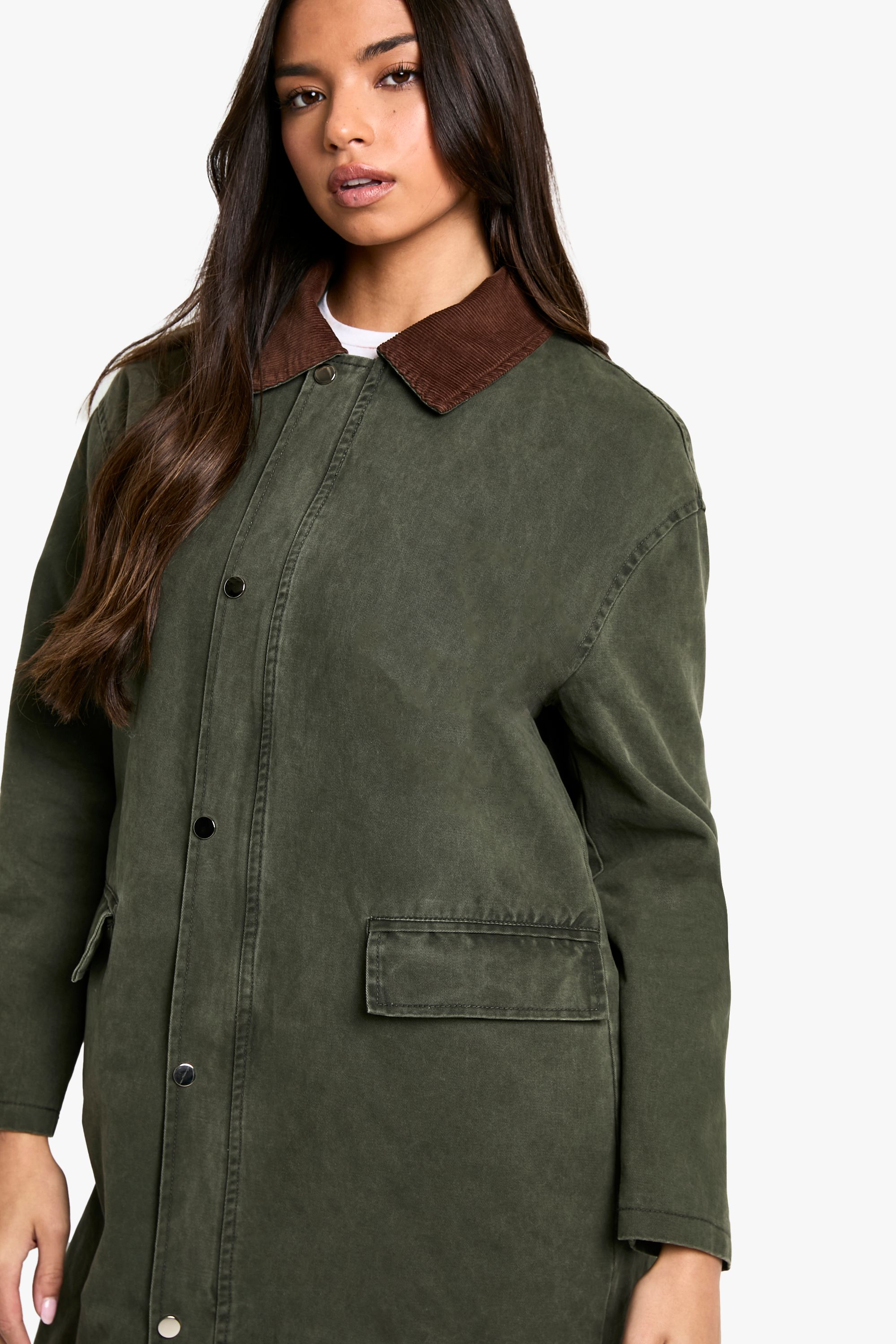 - Make a statement in this eye-catching corduroy collar jacket from Boohoo. Perfect for the fashion-forward woman who values both style and comfort, this piece effortlessly combines trendy design with everyday wearability. The longline cut offers a sleek silhouette, while the contrasting collar adds a distinctive flair to your ensemble. Style it over a crisp white tee and wide-leg trousers for a look that transitions seamlessly from daytime errands to casual evening gatherings. For a more relaxed vibe, pair it with your favourite jeans and trainers. The versatile nature of this jacket makes it an ideal choice for family get-togethers, brunch dates, or casual Fridays at the office. Embrace the latest trends without compromising on comfort with this must-have addition to your wardrobe.
