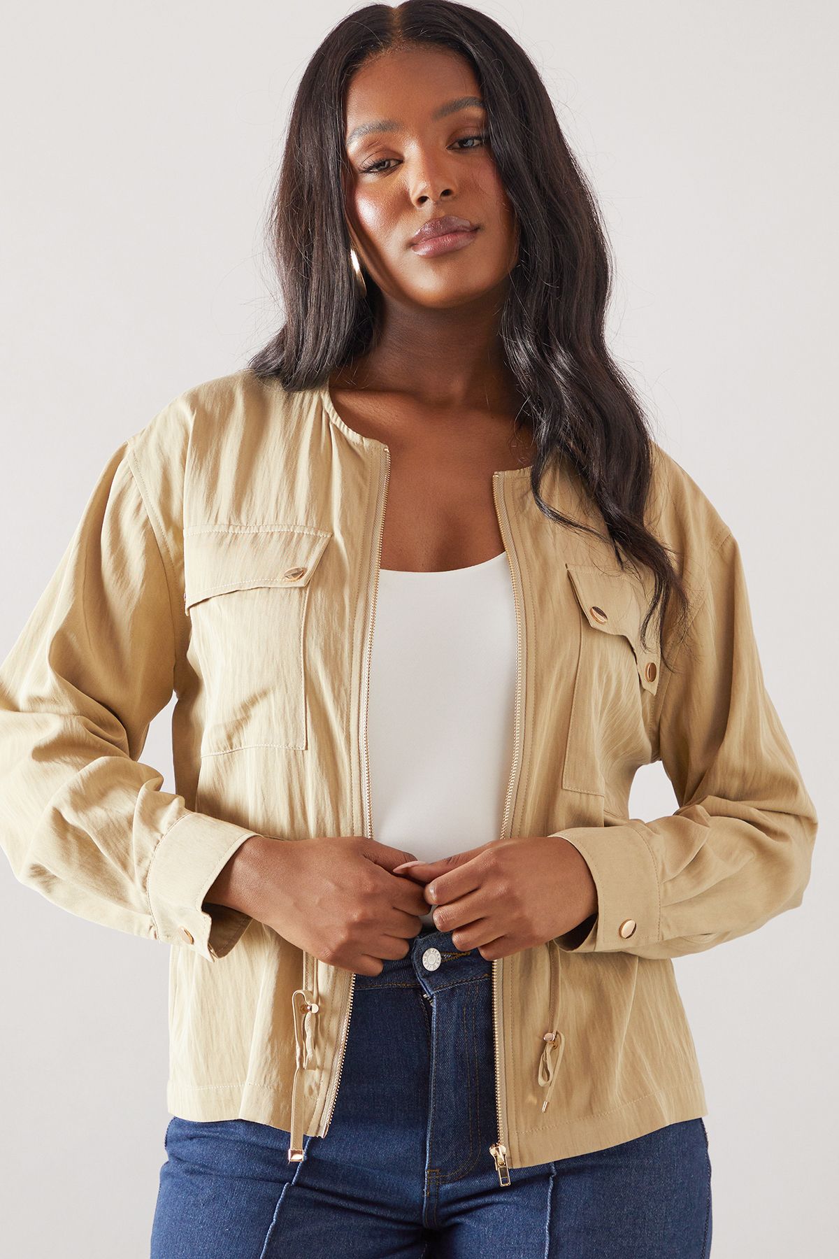 - Lightweight woven fabric perfect for transitional weather This versatile utility jacket combines practicality with sophisticated style. The clean lines and relaxed silhouette make it an essential layering piece for your daytime wardrobe. Style as seen with a simple white vest top, wide-leg jeans and trainers for casual weekend brunches or shopping trips. For a more refined look, pair with tailored trousers and loafers when meeting friends for lunch. The adjustable drawstring waist allows you to customise the fit to your preference, creating definition or a more relaxed look. Perfect for family gatherings or countryside walks, this jacket offers both functionality and elegance. The cotton-blend fabric provides comfort whilst maintaining structure, making it an ideal companion for unpredictable British weather. A true wardrobe staple that will complement your existing collection beautifully.