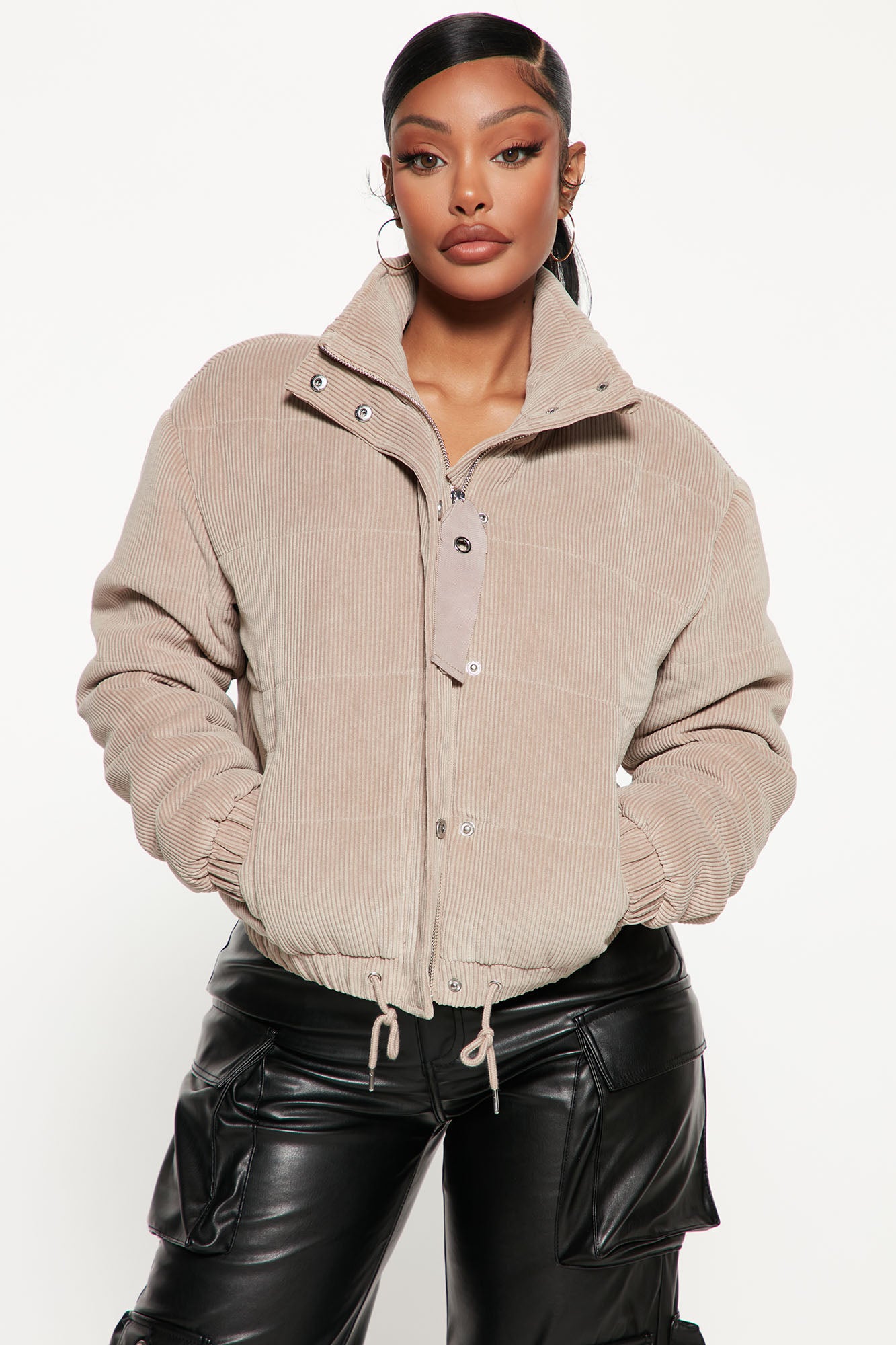 Available In Camel, Mauve And Taupe.Cropped Corduroy PufferDrawstring WaistHigh Neck CollarZipper And Snap Button FrontPocketsShell: 87% Polyester 13% NylonLining: 100% PolyesterPadding: 100% PolyesterImported