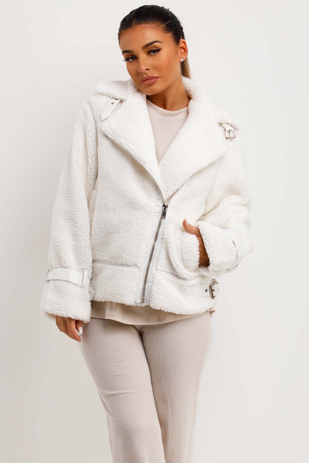 Teddy aviator jacket. This teddy aviator jacket is going to be your most loved piece in your outerwear wardrobe. Featuring soft lush teddy aviator jacket with zip fastening faux leather tabs extremely lightweight and warm. This teddy jacket is a need not a want. Also available in other colours.