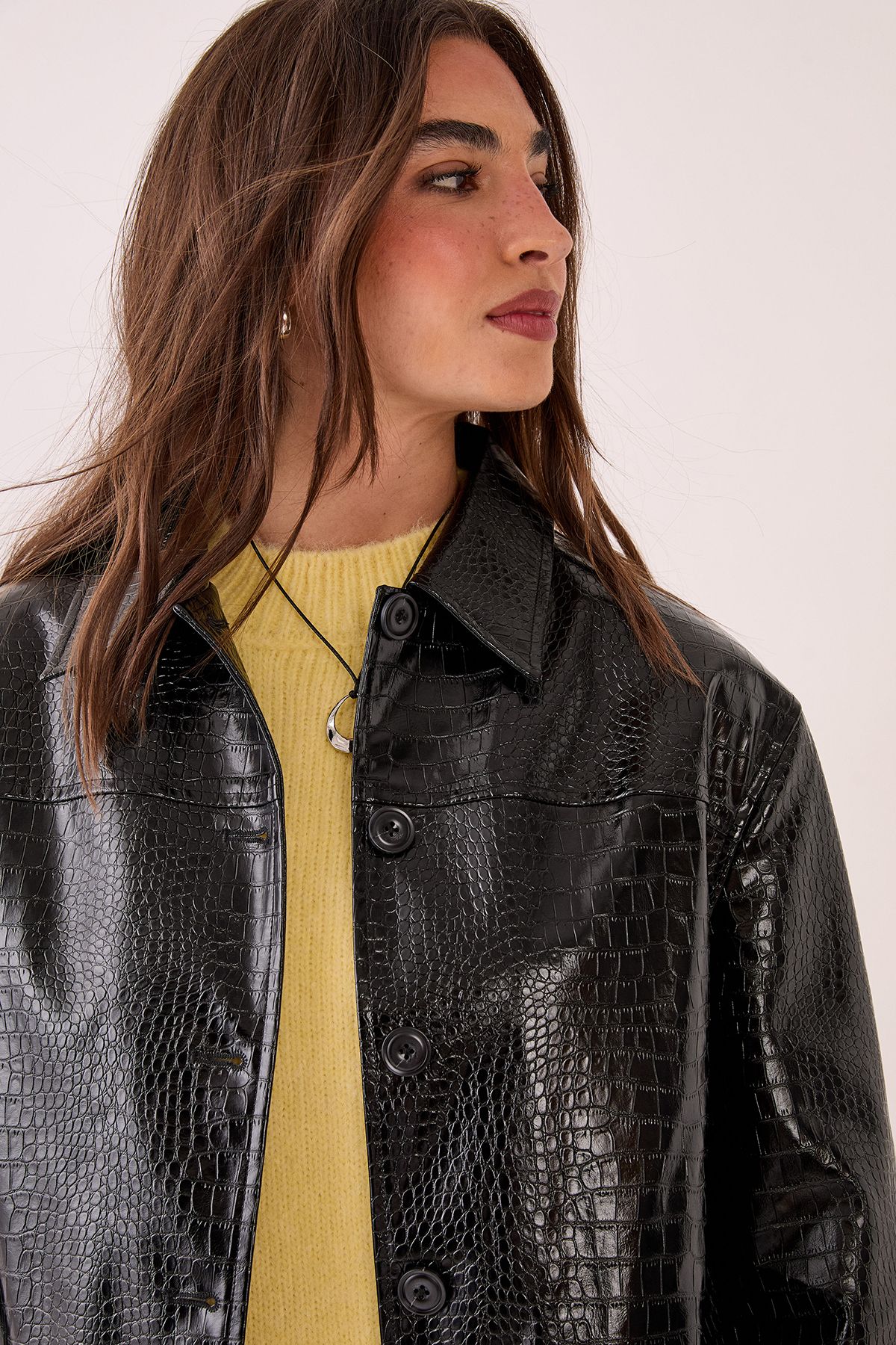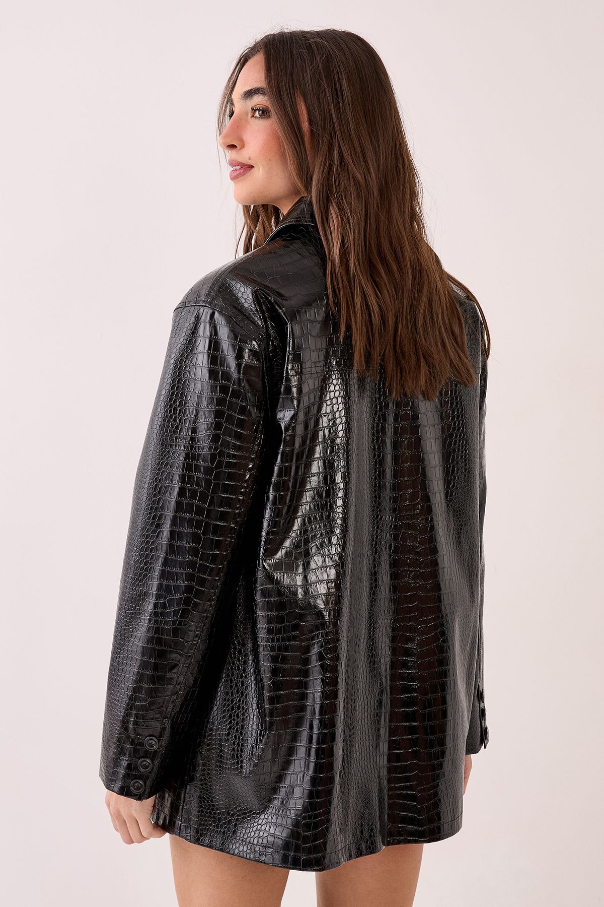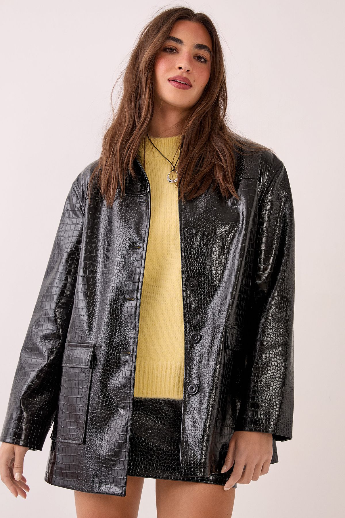 • Make a dramatic entrance in this NastyGal Croc Vinyl Faux Leather Clean Jacket. The high-shine finish and textured croc pattern create a look that commands attention whilst maintaining effortless cool. Style with a bright knit jumper and mini skirt for a striking contrast, or pair with tailored trousers and heeled boots for evening drinks. The relaxed fit allows for layering during cooler months, whilst the structured collar keeps the silhouette refined. Perfect for transitioning from day to night, this jacket works brilliantly for impromptu dinner plans after work. The wipe-clean surface is practical for city living, ensuring you stay looking polished regardless of the weather. A true wardrobe hero that brings edge to any ensemble.