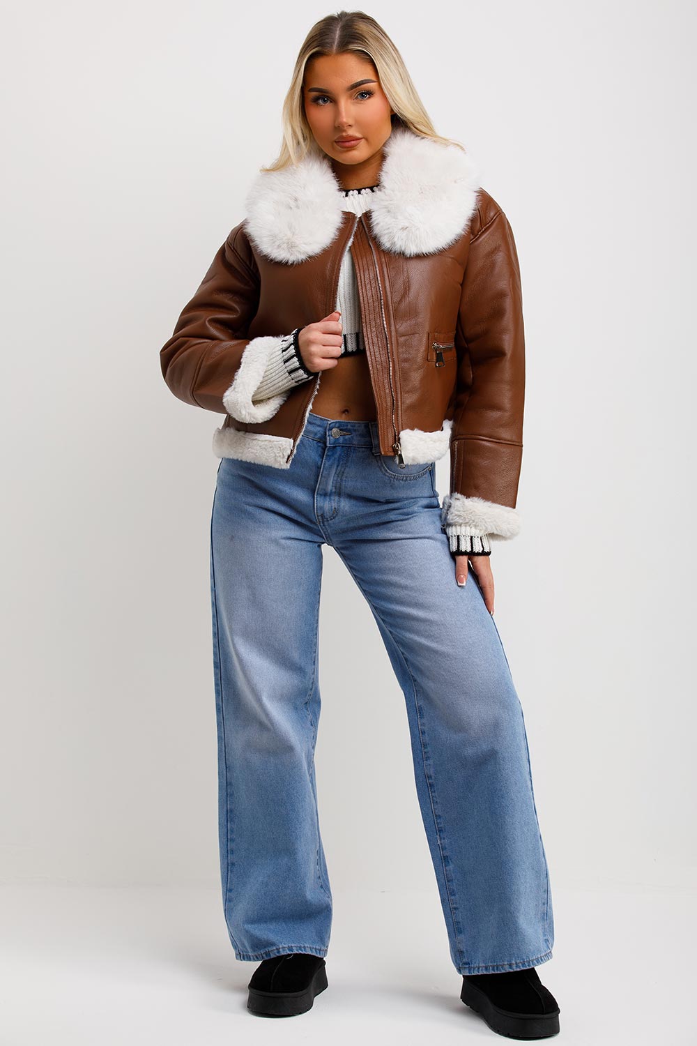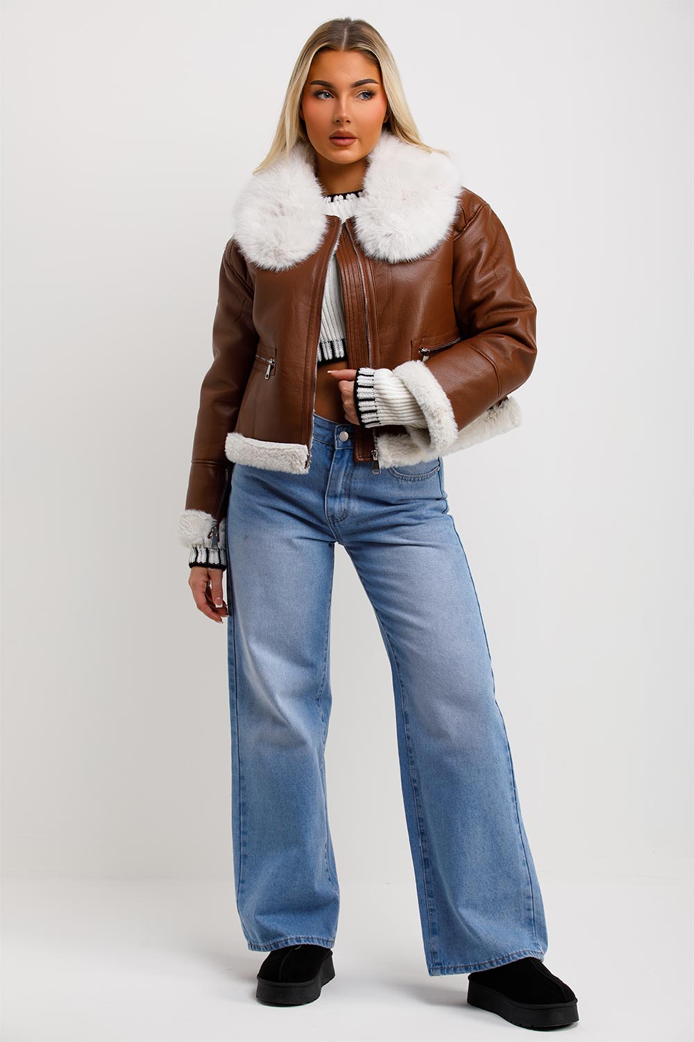 Crop aviator jacket with fur collar. This aviator jacket is a major trend in this new season. Added to your outerwear, this crop aviator jacket features faux fur collar cuffs zip fastening pockets and weather resistant. Style this cropped aviator jacket with any outfit to complete the cute casual look. This crop aviator jacket with fur collar is also available in other colours.