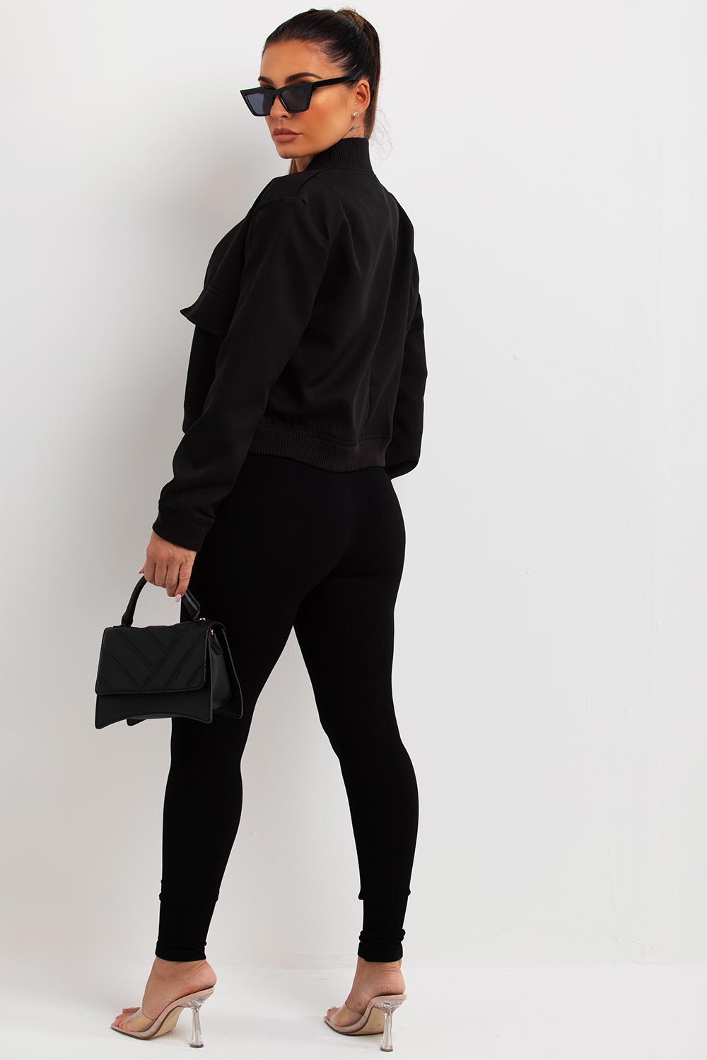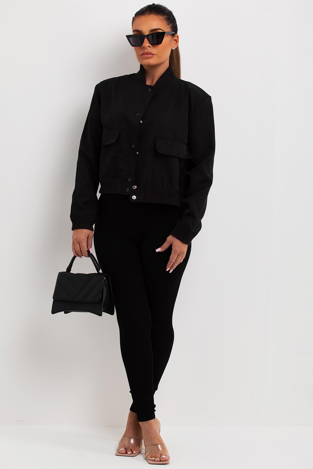 Crop bomber jacket. This bomber jacket is a must have outerwear piece for your new season fashion drobe. Featuring bomber jacket with round neckline long sleeves pocket detail shoulder pads and snap button fastening. Style this bomber with your favourite pieces to complete the look we are loving. Also available in other colours.