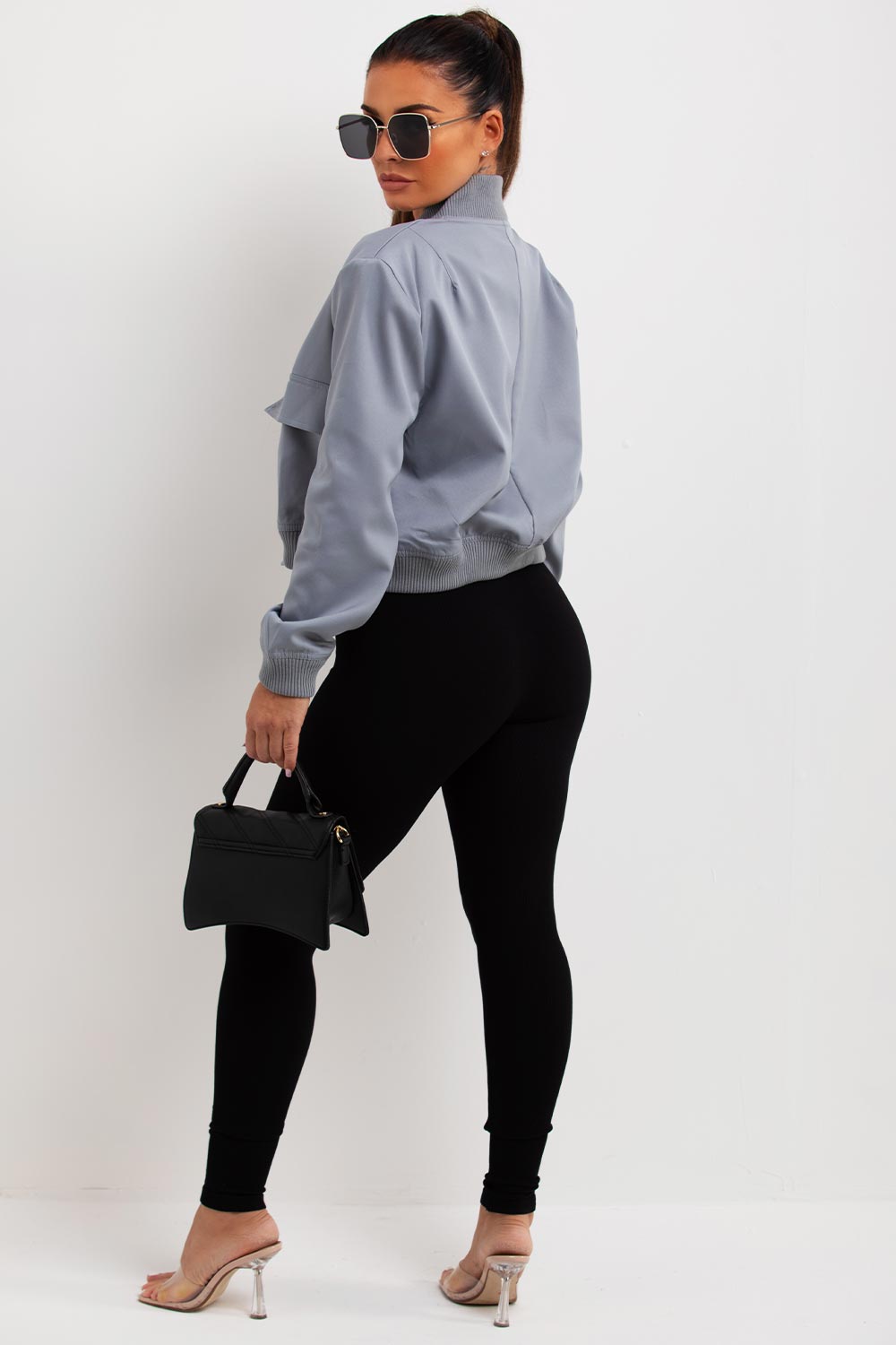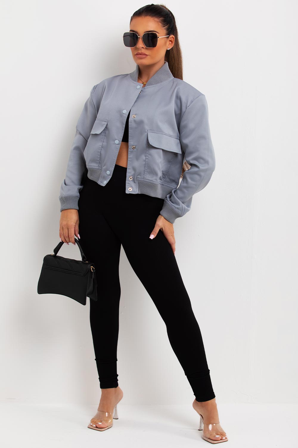 Crop bomber jacket. This bomber jacket is a must have outerwear piece for your new season fashion drobe. Featuring bomber jacket with round neckline long sleeves pocket detail shoulder pads and snap button fastening. Style this bomber with your favourite pieces to complete the look we are loving. Also available in other colours.