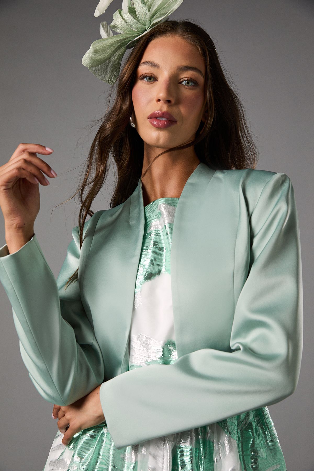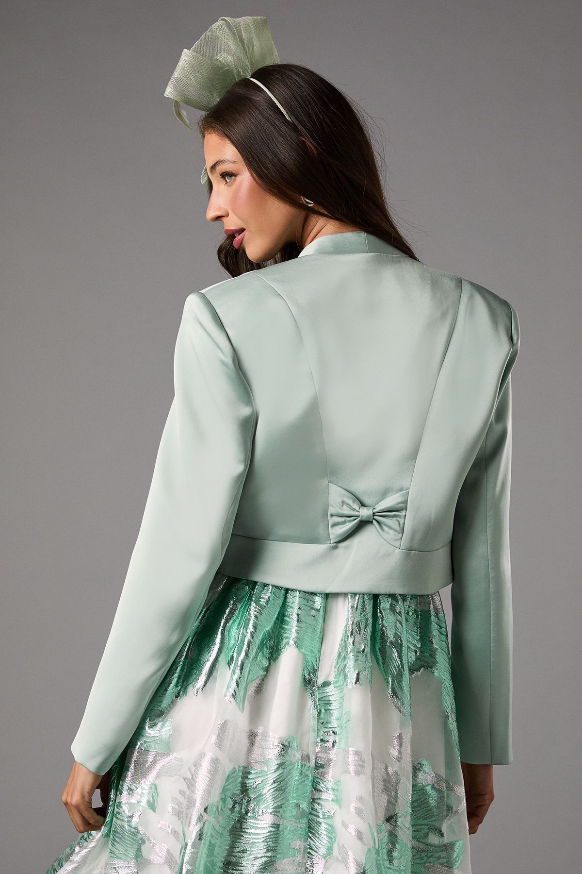- This exquisite Coast crop jacket brings understated elegance to any formal ensemble. The smooth satin fabric catches the light beautifully whilst the collarless design creates a modern, streamlined look that complements statement headpieces. Style over a printed midi dress as shown for race day sophistication, or pair with a tailored jumpsuit for wedding guest perfection. The cropped length works wonderfully with high-waisted styles, creating a balanced silhouette that flatters the figure. For evening events, layer over a sleek column dress and add statement earrings for a look that transitions effortlessly from ceremony to reception. The delicate bow detail on the reverse offers a subtle finishing touch that reflects Coast's attention to detail and commitment to creating pieces that feel special for those milestone occasions.