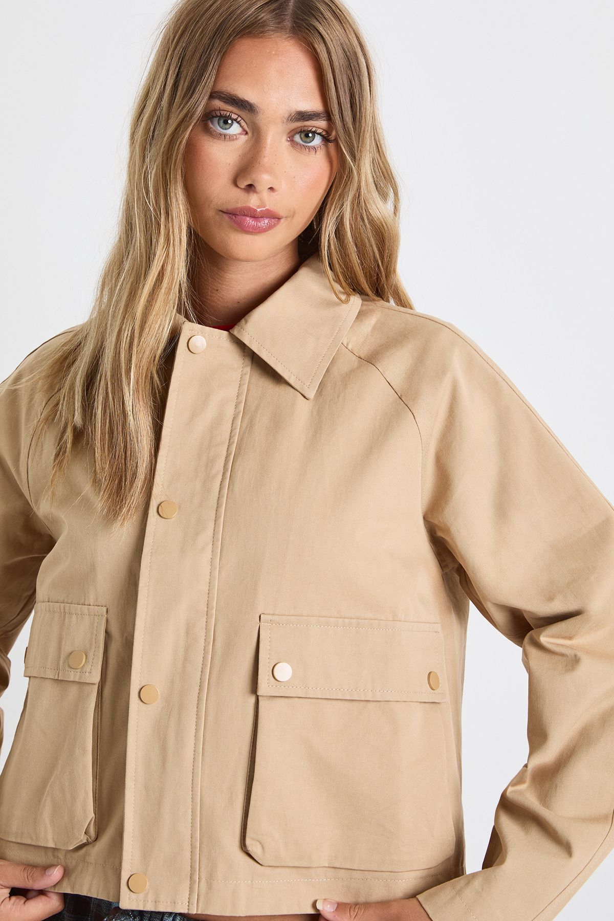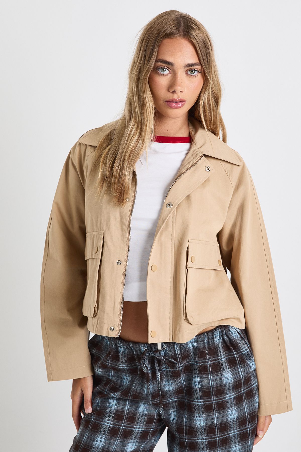 - This cropped utility jacket from Boohoo brings practicality to your casual wardrobe without compromising on style. The boxy, shortened cut creates a flattering silhouette that works brilliantly with high-waisted bottoms, as shown paired with the checked trousers. Style with a simple crop top underneath for daytime outings, or layer over a hoodie when the temperature drops. Perfect for family gatherings or weekend brunches, this versatile piece transitions effortlessly from shopping trips to casual meet-ups with friends. For a trendy look, pair with straight-leg jeans, trainers and a cap, or dress it up slightly with a midi skirt and ankle boots. The utility-inspired design offers a contemporary twist on the classic jacket, making it an essential addition to your everyday rotation.