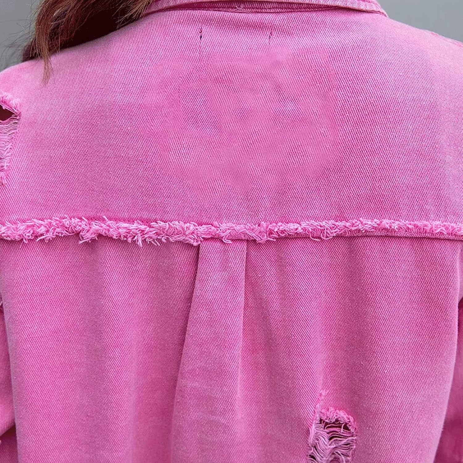 - Chic Embellishments: Stand out from the crowd with ripped denim with the relaxed fit. This trendy detail adds a touch of whimsy to the classic denim jacket silhouette, making it a statement piece in any wardrobe.