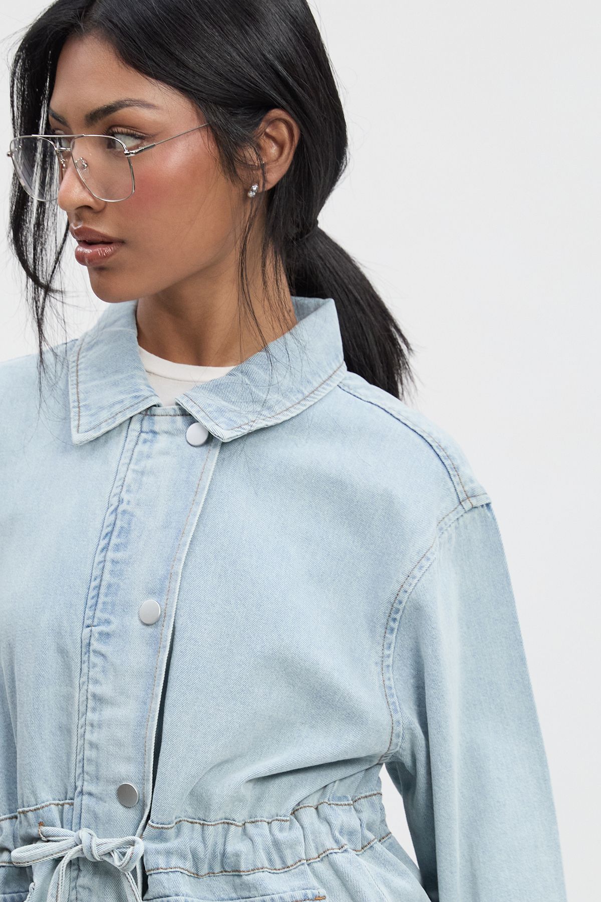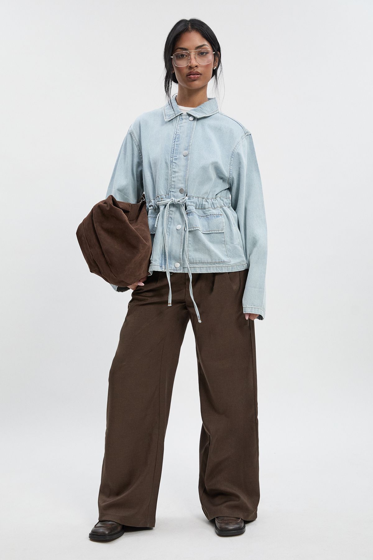 - This contemporary denim jacket offers a fresh twist on a wardrobe staple with its distinctive waist channel detail. The adjustable drawstring allows you to create multiple looks - wear it loose for a relaxed, boxy silhouette or cinched in for a more defined waistline. Style it as seen with a simple white tee and wide-leg trousers for an effortlessly cool daytime ensemble, perfect for weekend brunches or casual shopping trips. For cooler evenings, layer over a lightweight jumper with straight-leg jeans and trainers. The jacket's versatility makes it ideal for family gatherings or casual meet-ups with friends. Its relaxed proportions work brilliantly with both fitted and loose garments, making it an adaptable piece that will quickly become a go-to in your casual wardrobe rotation.