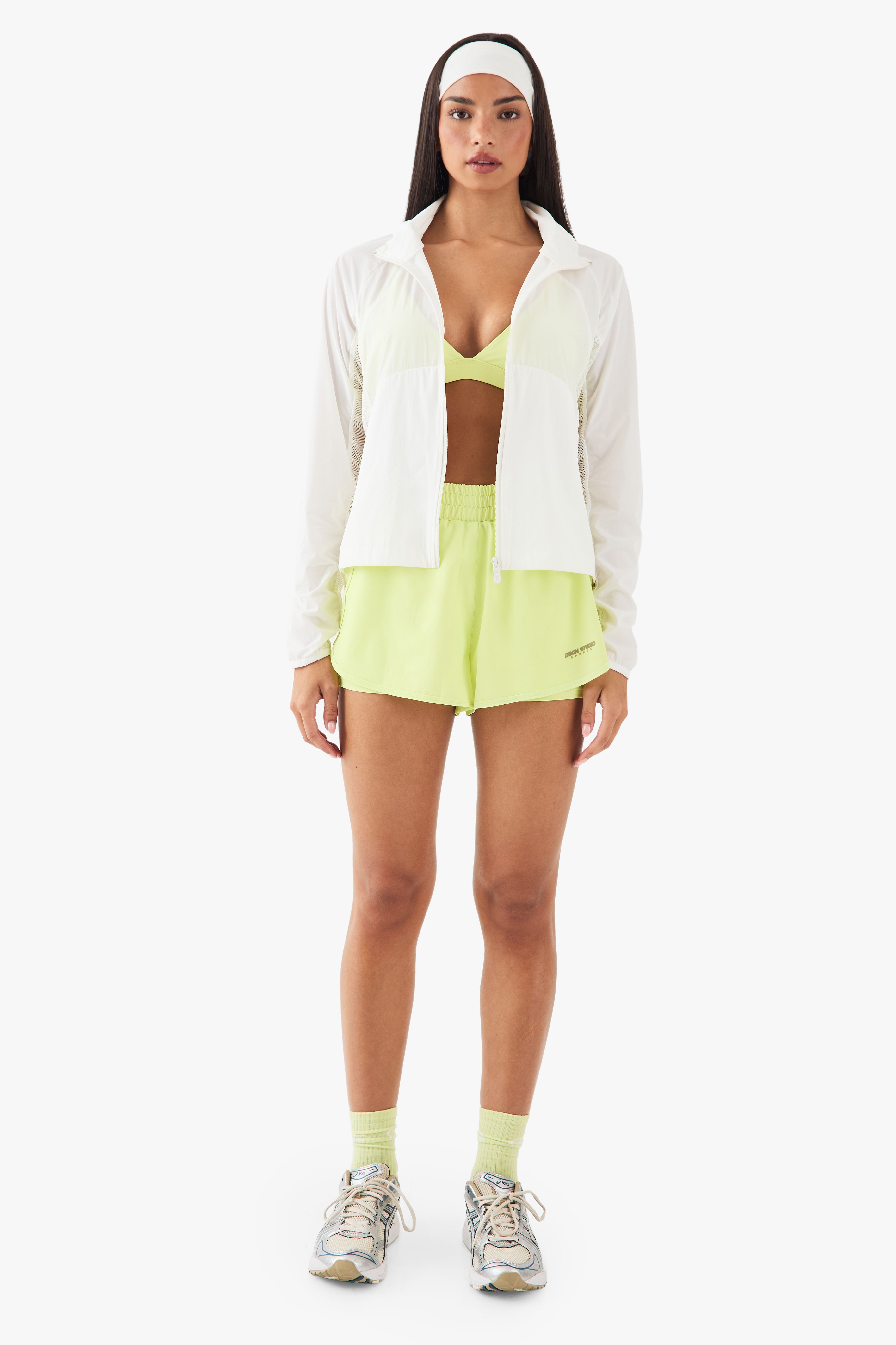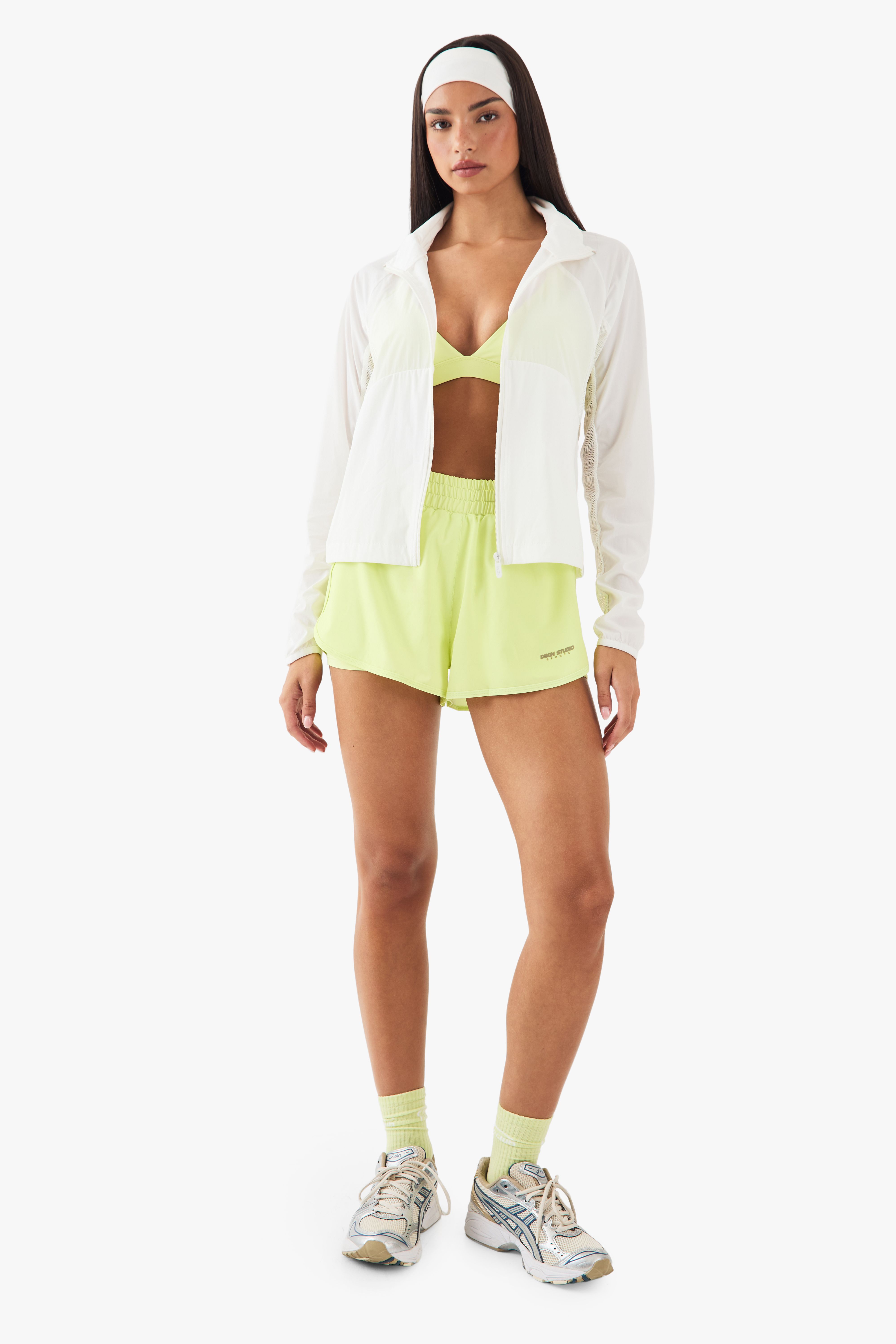 • Relaxed fit allowing for layering over sports bras or lightweight tops The DSGN Studio Light Weight Mesh Panel Running Jacket combines functionality with contemporary style for your active lifestyle. The thoughtfully placed mesh panels create a cooling effect during intense training sessions, whilst the high neck design offers protection against the elements. Perfect for morning jogs, evening runs or as a lightweight layer for your commute to the gym. Style with coordinating shorts as shown for a cohesive activewear ensemble, or pair with leggings and trainers for a practical workout look. The versatile design transitions effortlessly from exercise to casual outings, making it an essential addition to your activewear collection. Ideal for layering in transitional weather or as a standalone piece during warmer months, this jacket delivers on both performance and style for the fashion-conscious fitness enthusiast.