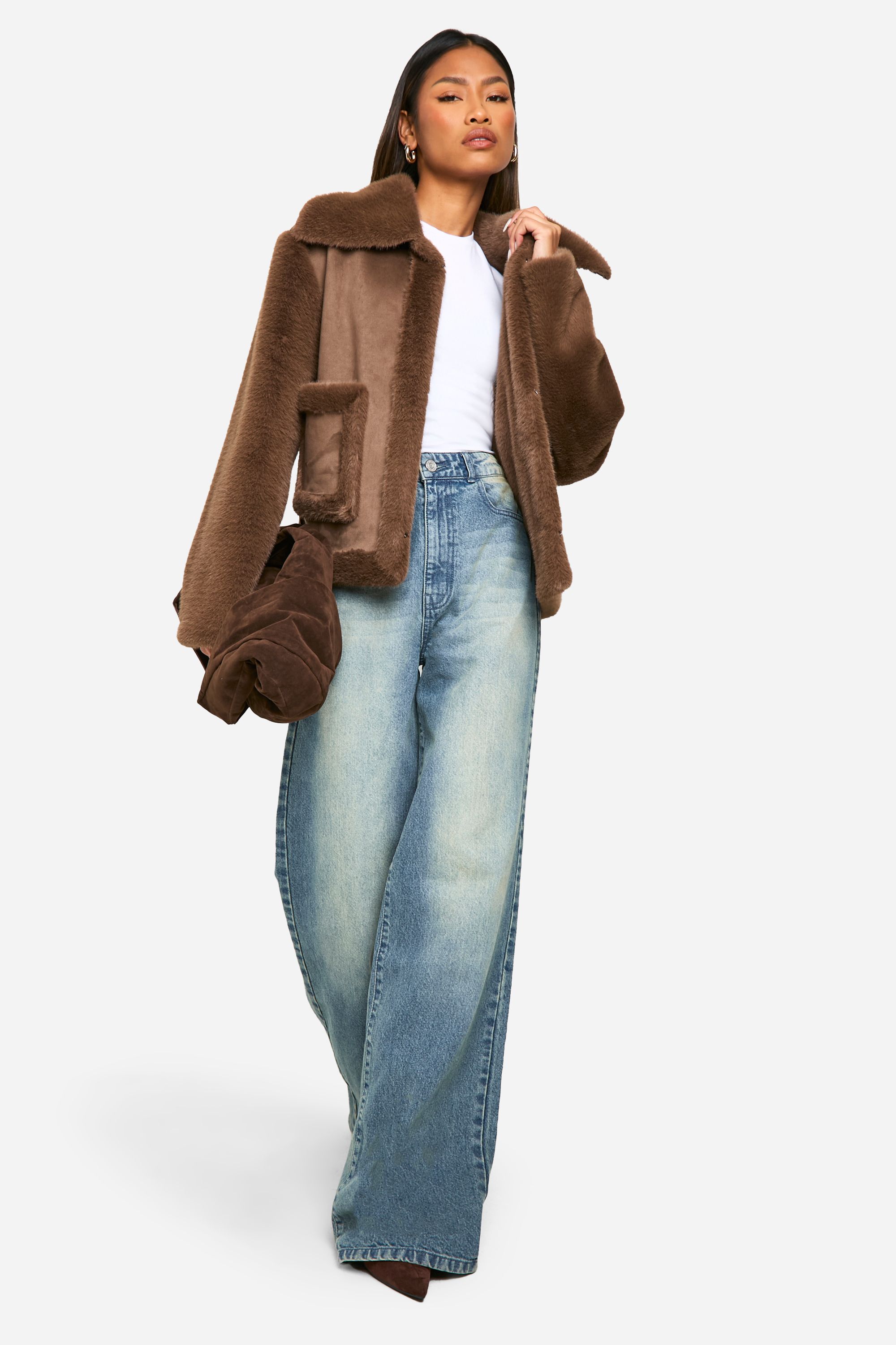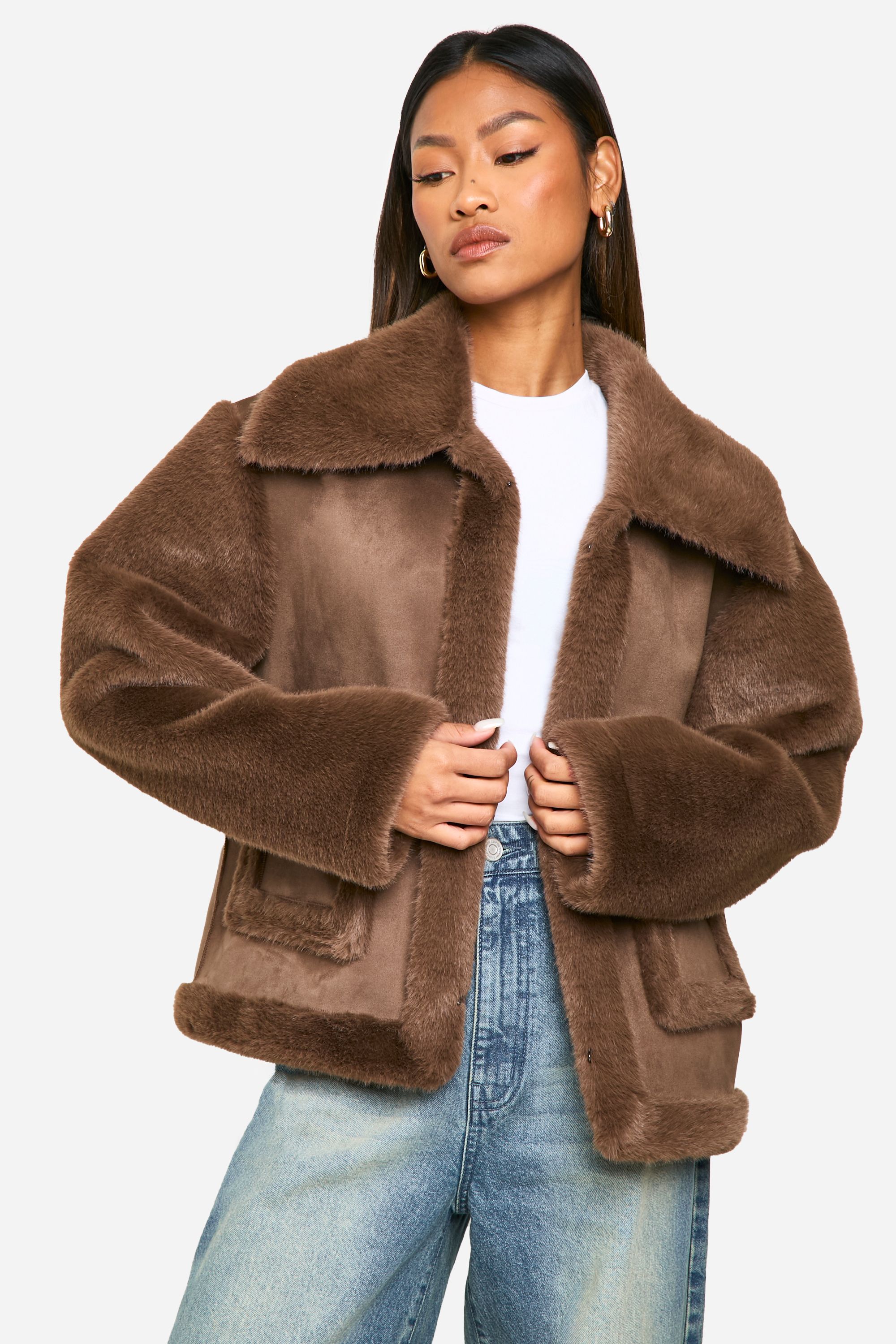 - Embrace the cosy charm of this short faux fur jacket, a must-have addition to your autumn-winter wardrobe. The sumptuous texture and oversized collar create a luxurious feel, while the relaxed fit allows for easy layering over your favourite jumpers and tees. Style it with high-waisted jeans and trainers for a casual daytime look, or throw it over a midi dress and ankle boots for an evening out with friends. The contrasting patch pockets not only add a unique design element but also provide practicality for stashing your essentials. Perfect for brisk walks in the park, casual coffee dates, or adding a touch of glamour to your everyday ensemble, this jacket is a versatile piece that will keep you looking chic and feeling snug all season long.