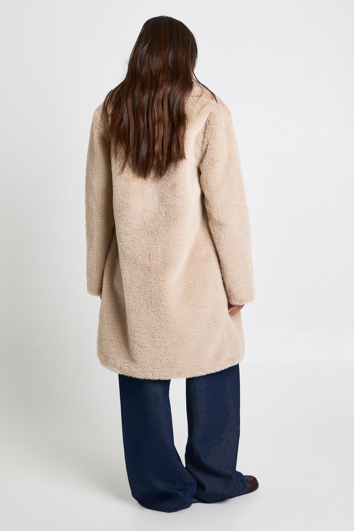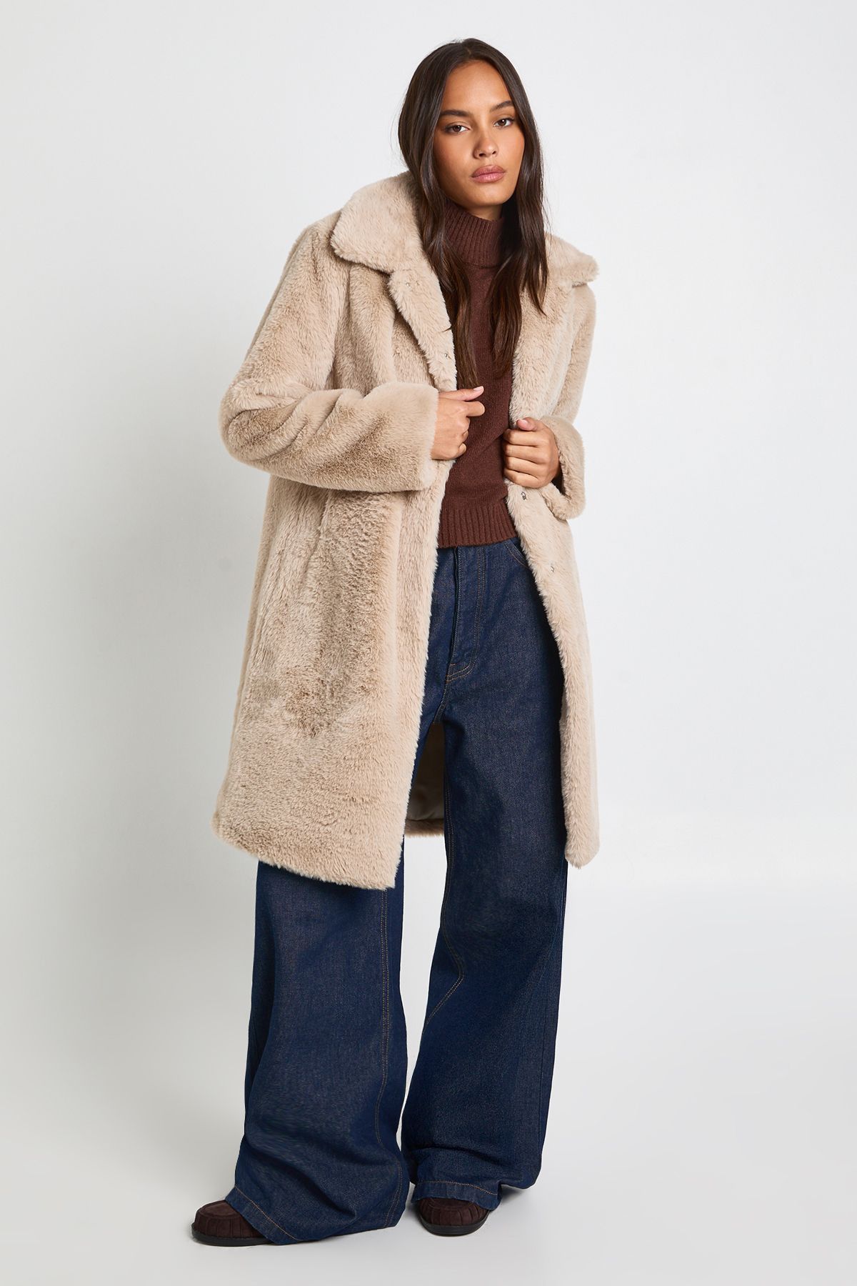 - Luxurious faux fur collar adds a touch of glamour to this midaxi-length jacket