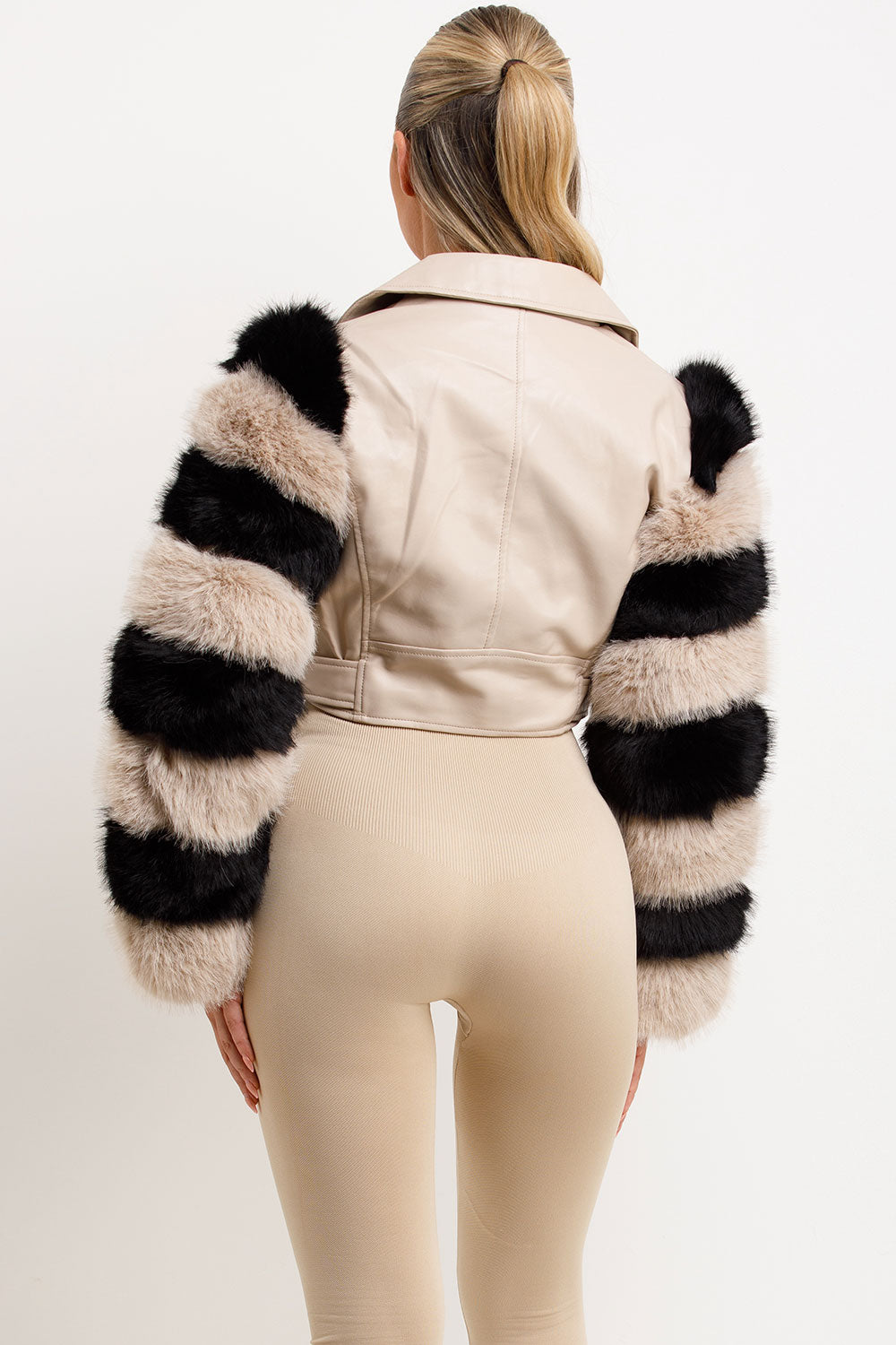 Faux fur faux leather aviator jacket with contrast fur sleeves. This fur sleeve aviator jacket is going to level up your new season look effortlessly. Featuring faux leather aviator jacket with contrast faux fur sleeves zip and belt fastening short length , vegan friendly. Style this faux fur faux leather jacket with matching accessories to complete the look we are loving. This faux fur faux leather aviator jacket is also available in other colours.