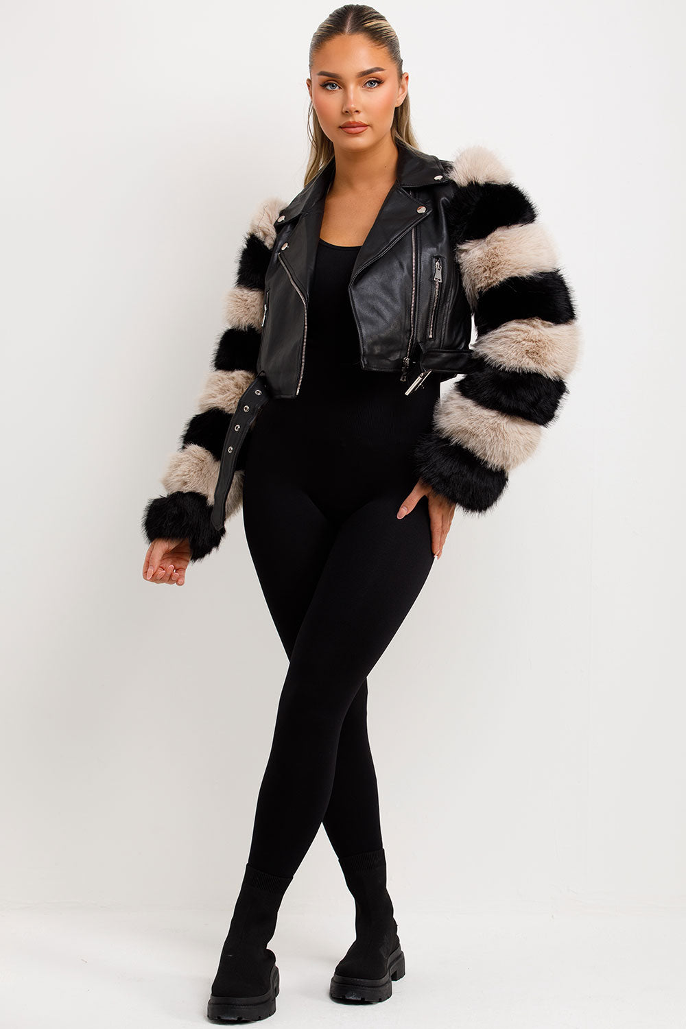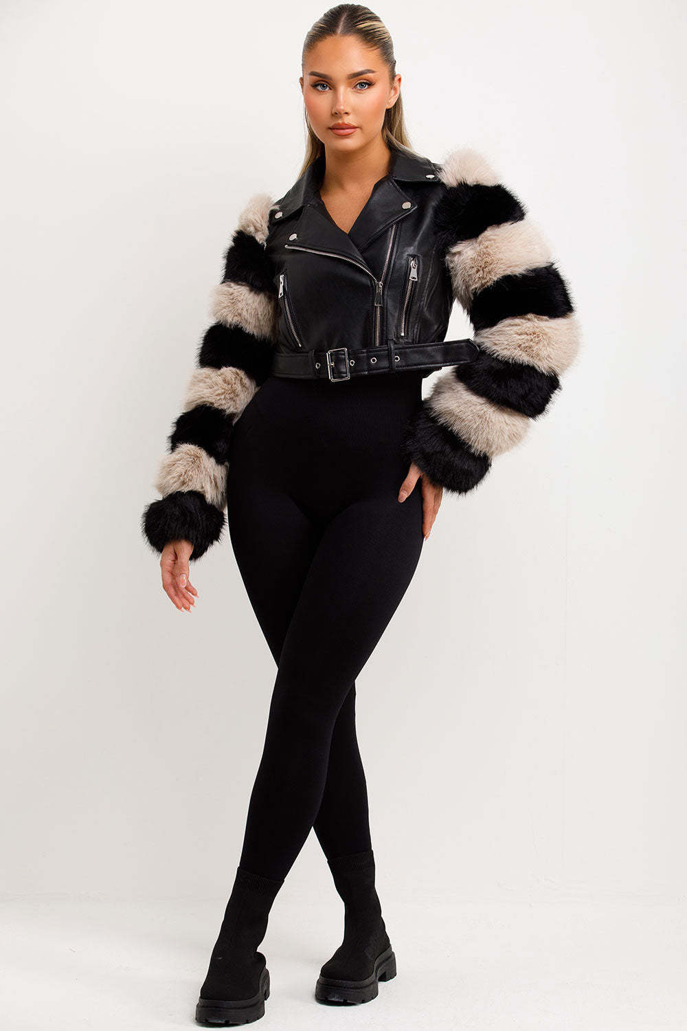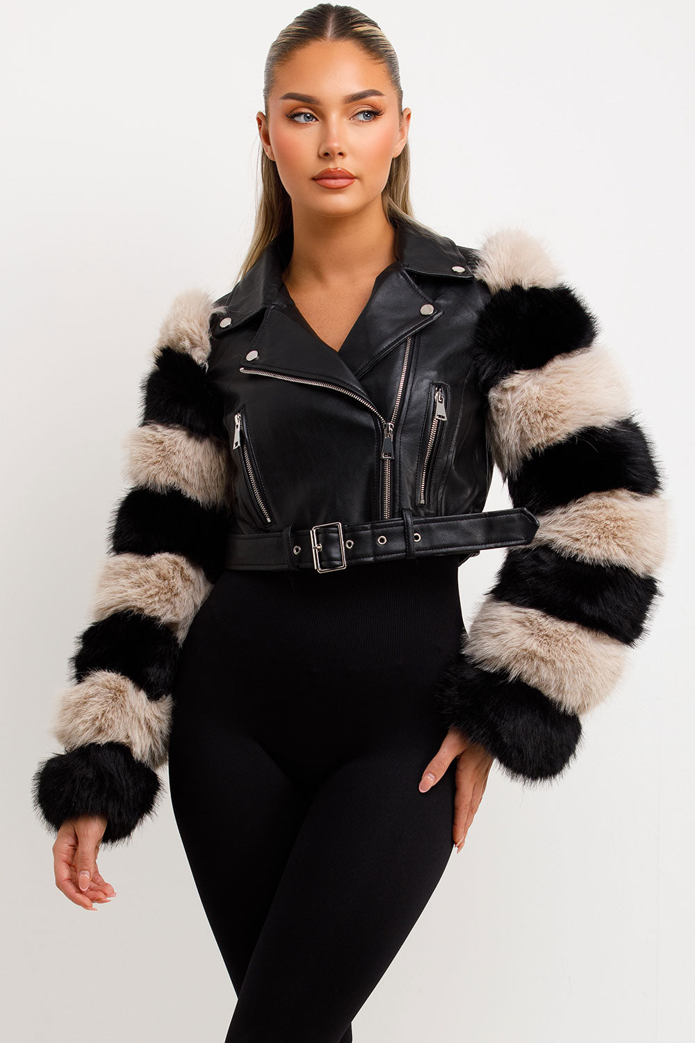 Faux fur faux leather aviator jacket with contrast fur sleeves. This fur sleeve aviator jacket is going to level up your new season look effortlessly. Featuring faux leather aviator jacket with contrast faux fur sleeves zip and belt fastening short length , vegan friendly. Style this faux fur faux leather jacket with matching accessories to complete the look we are loving. This faux fur faux leather aviator jacket is also available in other colours.