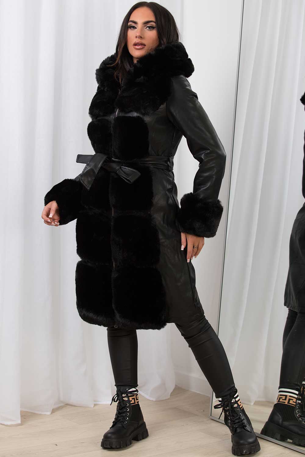 Faux leather faux fur hooded jacket longline. Featuring faux leather material with luxury faux fur trim, belted, long faux fur cuff sleeves and faux fur lined. Style it with our knitwear and jeans for every day glam look. Also available in black.