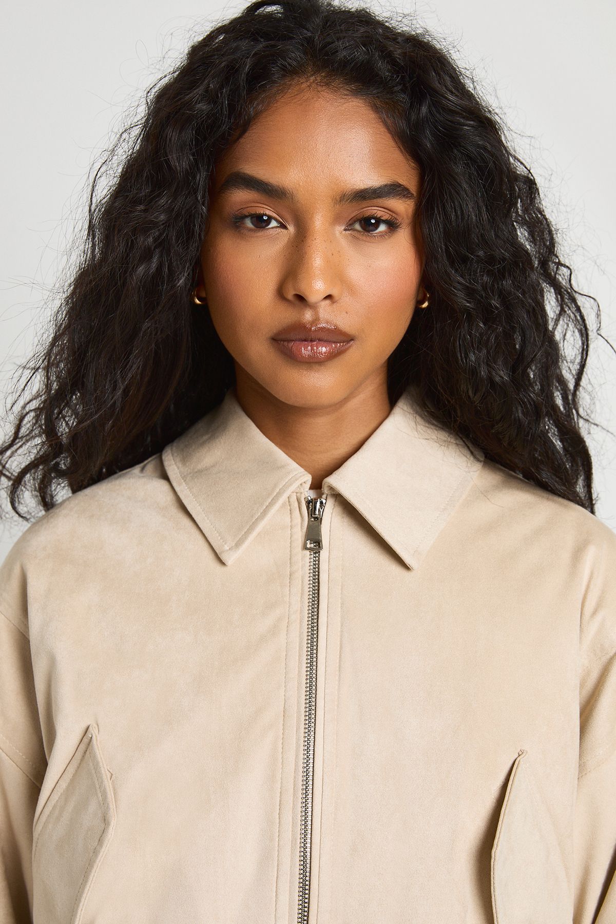 - This suede bomber jacket brings a contemporary twist to a timeless silhouette with its cropped length and clean lines. Perfect for casual daytime looks, it pairs brilliantly with high-waisted jeans and a simple tee for coffee dates or weekend shopping trips. Style with wide-leg trousers and trainers for an on-trend street style moment, or throw over a midi dress with ankle boots when the evening turns cool. The versatile design works wonderfully layered with a checked shirt tied at the waist for added dimension. This Boohoo staple transitions seamlessly between seasons-wear open over a bodysuit during warmer months or zipped up with a chunky knit scarf when temperatures drop. An essential piece for the fashion-forward wardrobe that balances practicality with undeniable style.