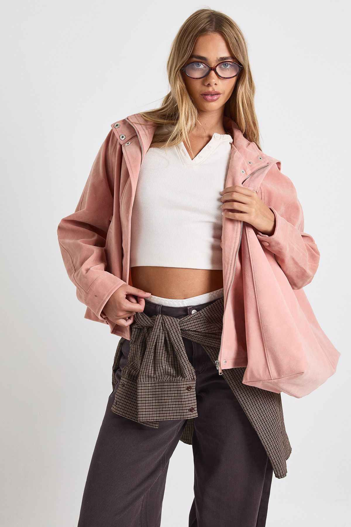 • This faux suede bomber jacket brings casual sophistication to your everyday wardrobe. The relaxed silhouette offers a contemporary take on the classic bomber style, making it perfect for layering over crop tops and high-waisted trousers as shown. The jacket's versatile design transitions seamlessly from daytime coffee runs to evening casual gatherings with friends. Style with dark trousers and trainers for an effortlessly cool weekend look, or throw over a simple dress with ankle boots for a more put-together casual ensemble. The textured finish adds subtle interest while maintaining the jacket's laid-back appeal, making it an essential piece for those in-between season days when you need something light yet stylish. Perfect for family gatherings or casual outings when you want to look fashionable without appearing overdressed.