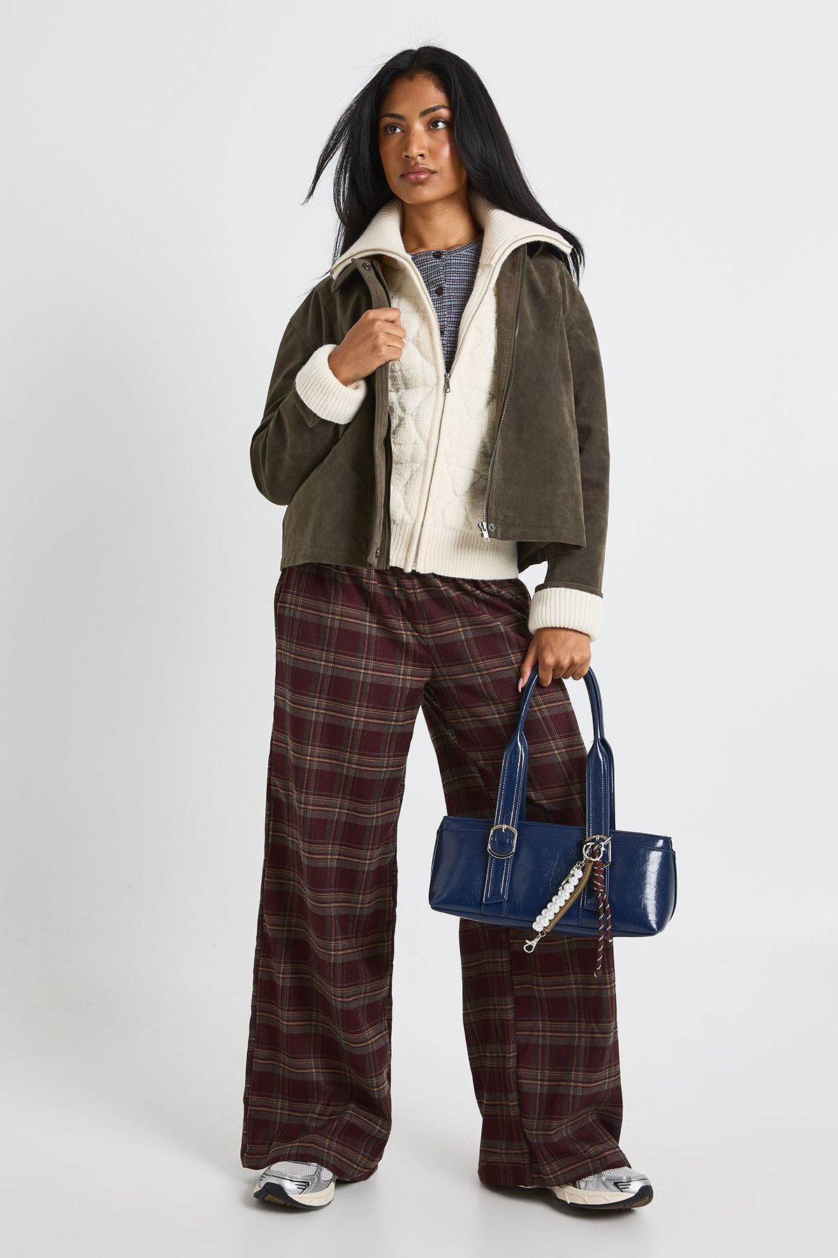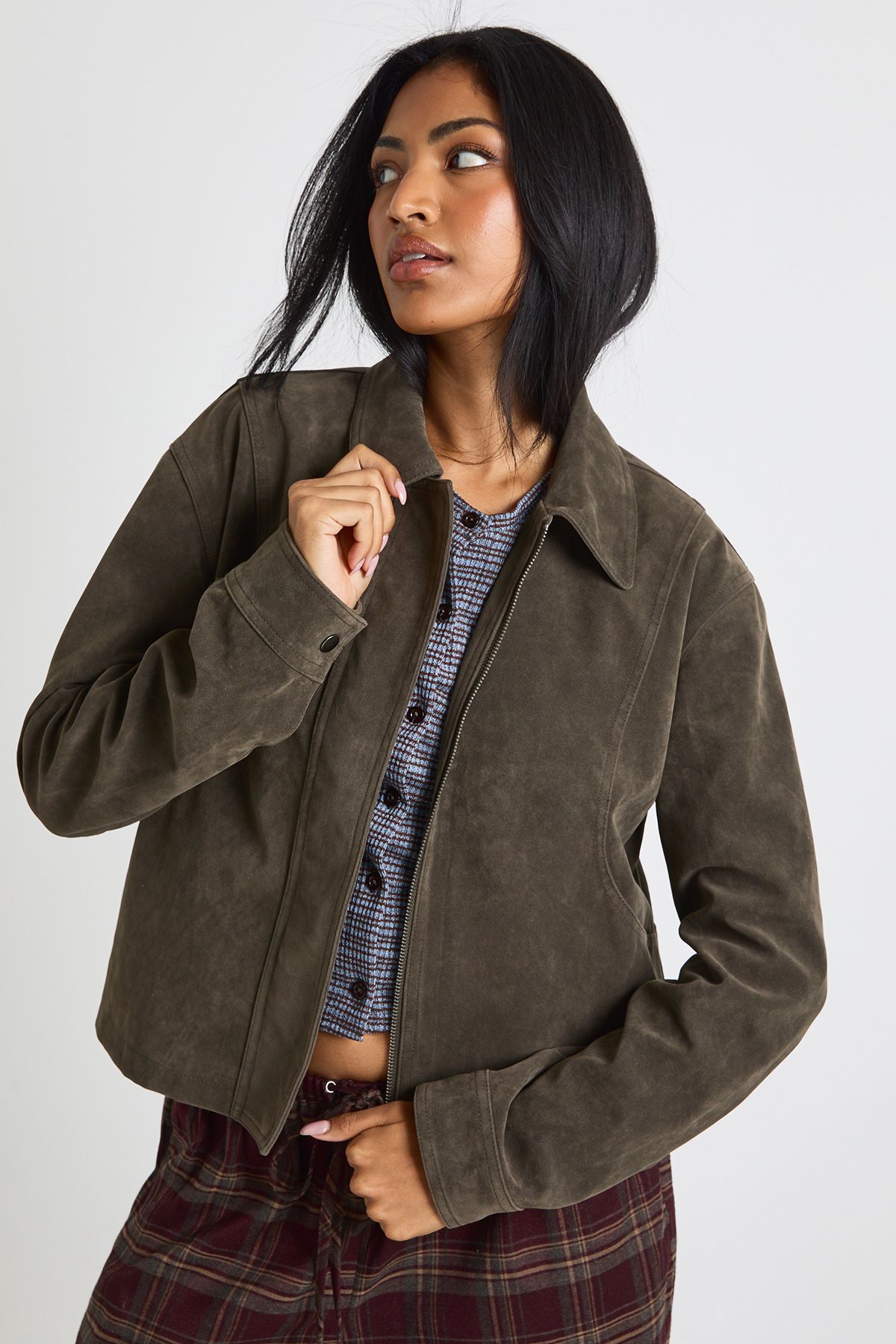 - Soft-touch fabric with a luxurious appearance that adds sophistication to casual outfits This faux suede collared jacket brings a touch of retro charm to your everyday wardrobe. The contrasting plush collar and cuffs create a striking visual element that enhances its casual appeal. Style it as seen with wide-leg checked trousers and trainers for a relaxed weekend look, or pair with your favourite jeans and ankle boots for coffee dates and shopping trips. The versatile design makes it perfect for family gatherings and casual outings when the temperature drops. Layer over a simple tee or chunky knit depending on the weather. Its relaxed fit allows for comfortable movement while maintaining a fashionable silhouette. This Boohoo jacket is a brilliant transitional piece that will quickly become your go-to for adding texture and interest to your casual ensembles.