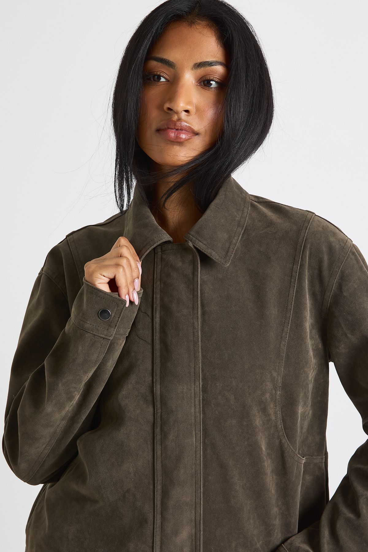 - Faux suede jacket with contrasting plush collar for added texture and warmth