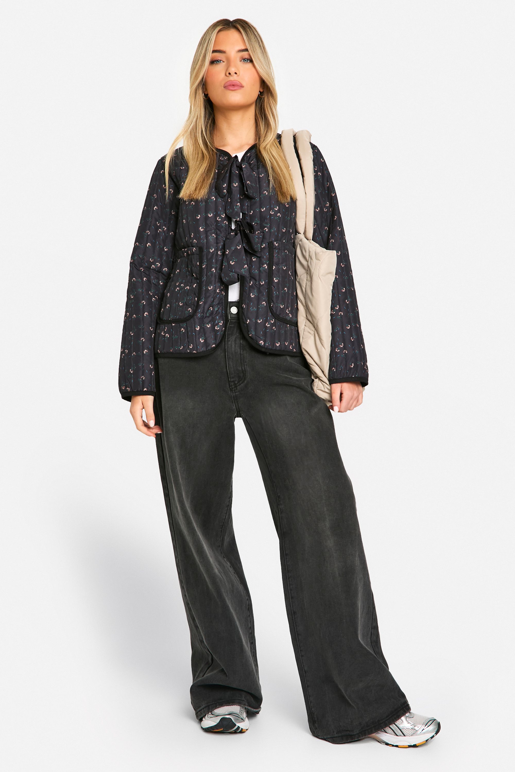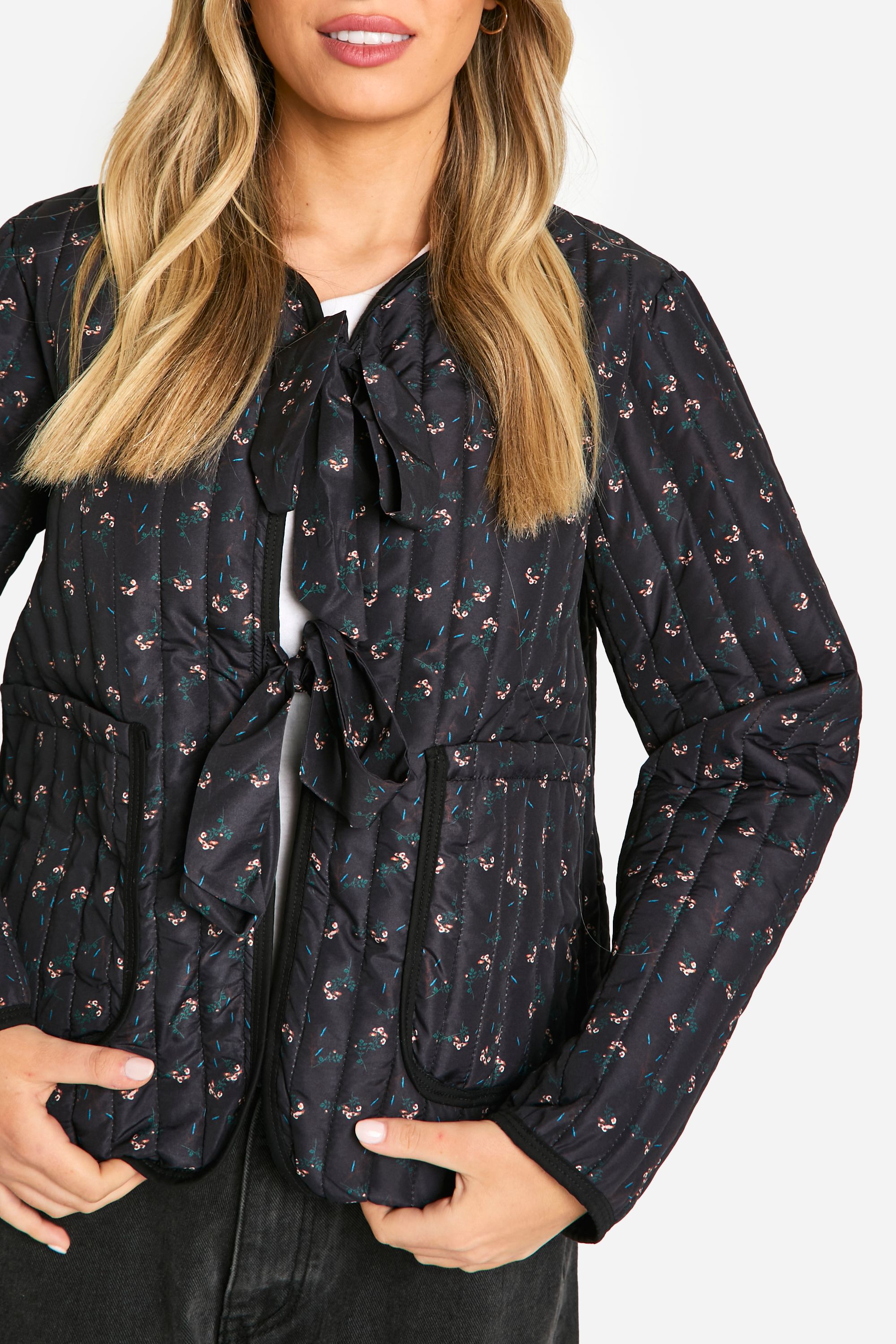 - Embrace the charm of casual chic with this delightful floral steppjacket. The eye-catching bow detail at the neckline adds a feminine touch to the quilted design, making it a perfect blend of comfort and style. Ideal for those crisp autumn days or cool spring evenings, this jacket is a versatile addition to your wardrobe. Style it with wide-leg trousers and trainers for a relaxed daytime look, or throw it over a simple dress for a family gathering. The cropped length works wonderfully with high-waisted bottoms, creating a balanced silhouette. For a trendy ensemble, pair it with dark denim jeans, a white tee, and ankle boots. Whether you're heading to a casual brunch or a weekend farmers' market, this jacket will keep you looking effortlessly stylish while providing just the right amount of warmth.