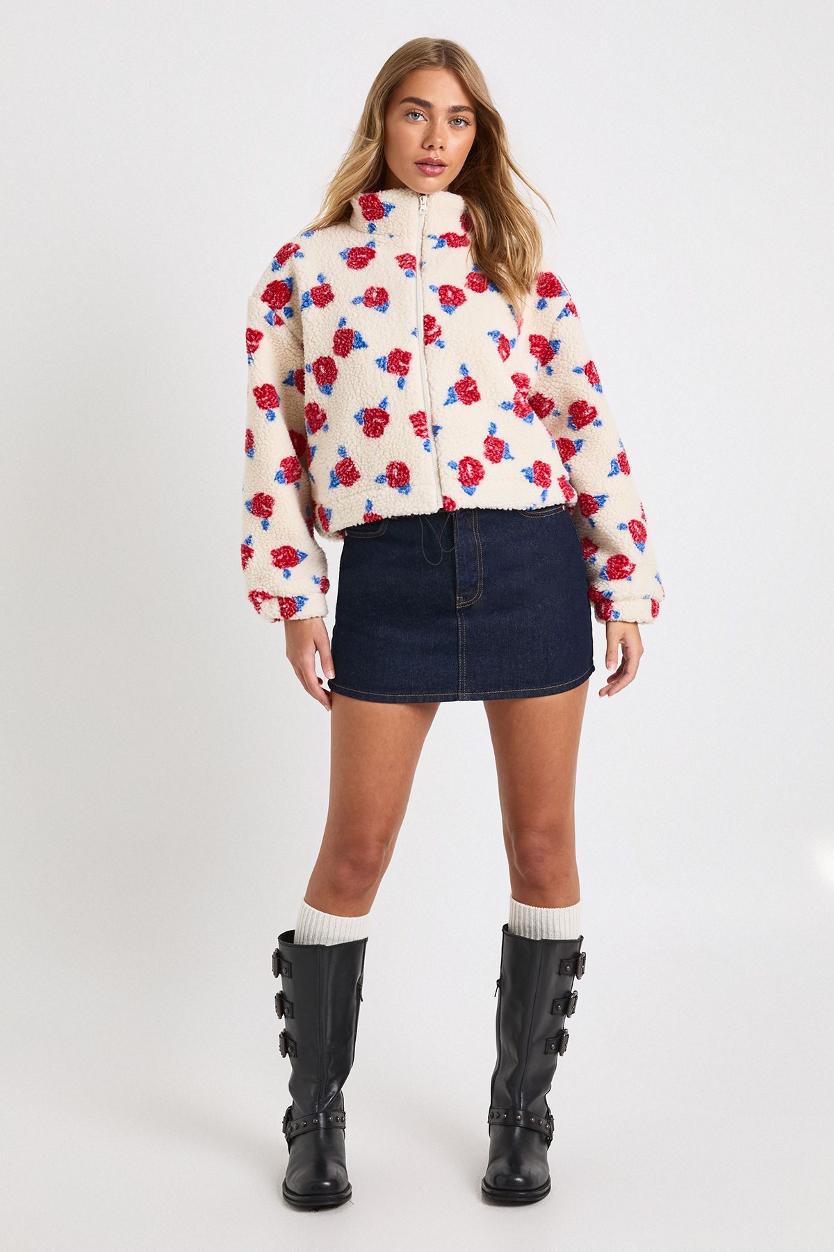 - Make a statement with this eye-catching Flower Teddy Zip Bomber Jacket from Boohoo. The soft teddy texture combined with the bold floral pattern creates a playful yet stylish piece that's perfect for adding character to your casual wardrobe. Style it as shown with a simple white top and denim mini skirt for an effortlessly cool daytime look. For chillier days, pair with straight-leg jeans, chunky socks and boots for extra warmth without compromising on style. This bomber jacket works brilliantly for casual outings, coffee dates with friends, or weekend shopping trips. The cropped length is particularly flattering when worn with high-waisted bottoms, creating a balanced silhouette. A versatile addition to your collection that will bring a cheerful touch to your everyday ensembles throughout the seasons.