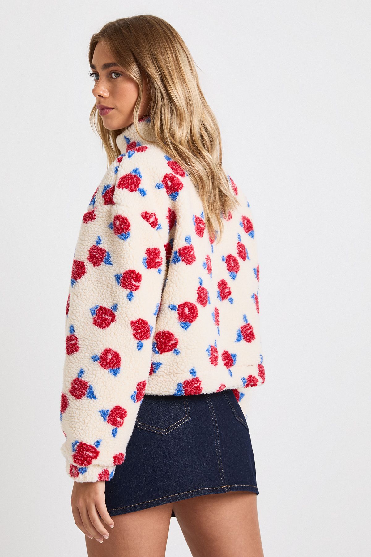 - Plush teddy fabric bomber jacket with vibrant floral print throughout