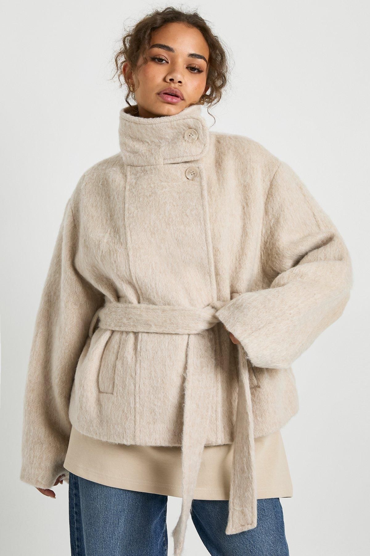 - Stylish wool blend jacket featuring a flattering belted design to cinch the waist