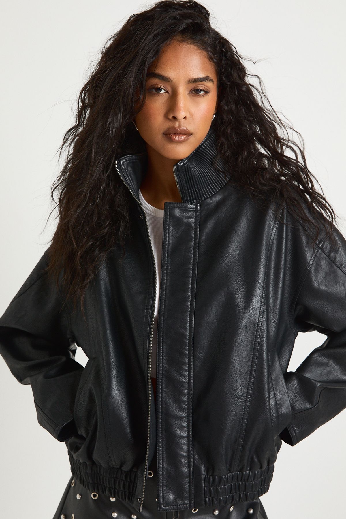• Make a bold statement with this funnel neck bomber jacket that combines retro athletic style with modern attitude. The relaxed silhouette creates a fashionable oversized look that's perfect for layering over everything from casual basics to evening attire. Style with cycling shorts and chunky trainers for daytime cool, or throw over a slip dress with heeled mules for evening drinks with the girls. The elasticated hem creates a flattering silhouette while the funnel neck adds a contemporary twist to this classic style. Perfect for unpredictable British weather, this versatile piece works brilliantly for family gatherings, weekend brunches or casual Friday office wear. For a complete look, pair with your favourite Boohoo midi skirt and boots, or keep it casual with straight-leg jeans and trainers for an effortlessly cool vibe.