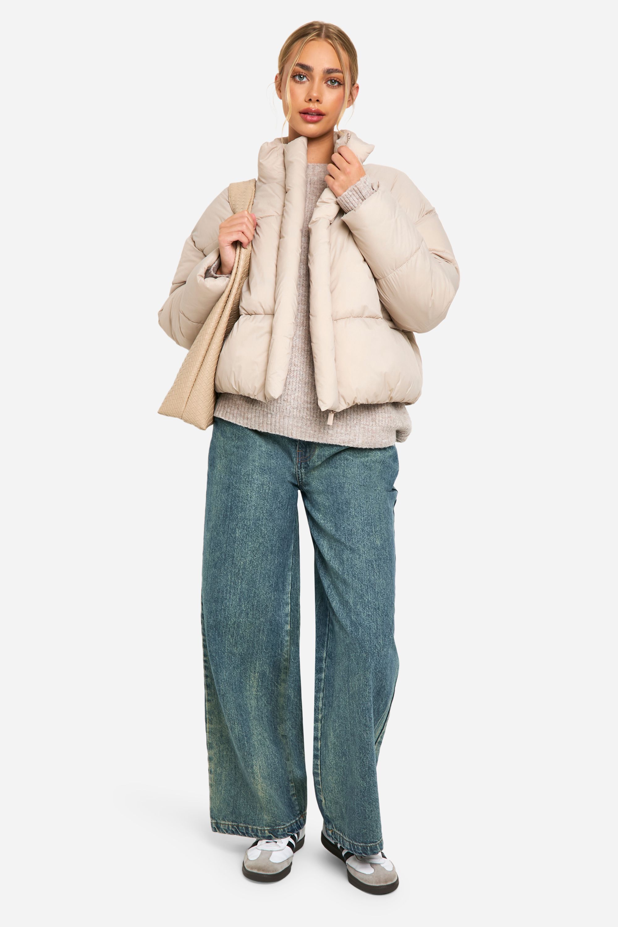 - Embrace the chilly weather in style with this eye-catching quilted puffer jacket. The standout funnel collar not only adds a fashionable edge but also provides extra protection against the elements. Its oversized, boxy silhouette offers a contemporary look that's perfect for layering over your favourite jumpers and tees. Whether you're heading to a casual lunch with friends or running weekend errands, this jacket is your go-to piece for effortless cool-weather dressing. Pair it with wide-leg jeans and trainers for a relaxed daytime look, or throw it over a midi dress and boots for a chic contrast. The versatile design makes it easy to customise your outfit for various casual occasions, from family gatherings to impromptu coffee dates. With its cosy padding and practical features, this puffer jacket combines fashion-forward style with functional comfort, making it an essential addition to your autumn and winter wardrobe.