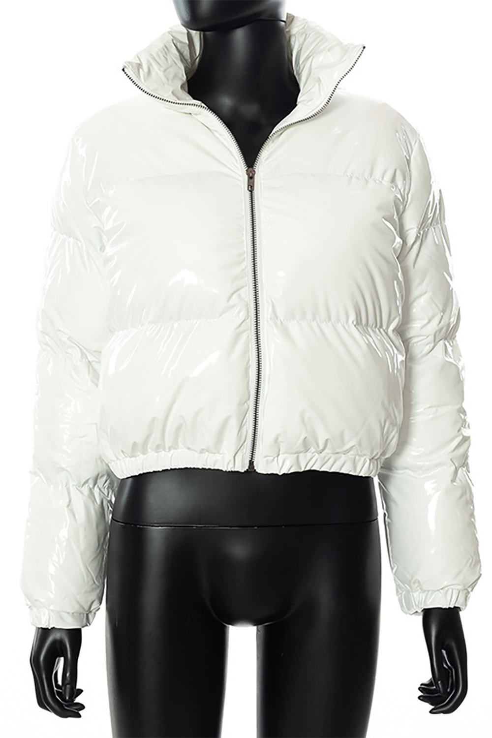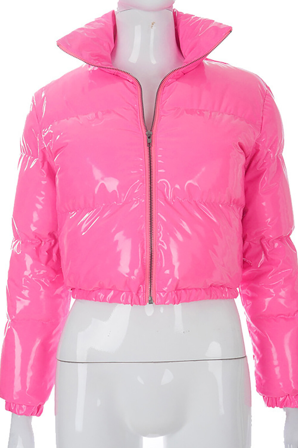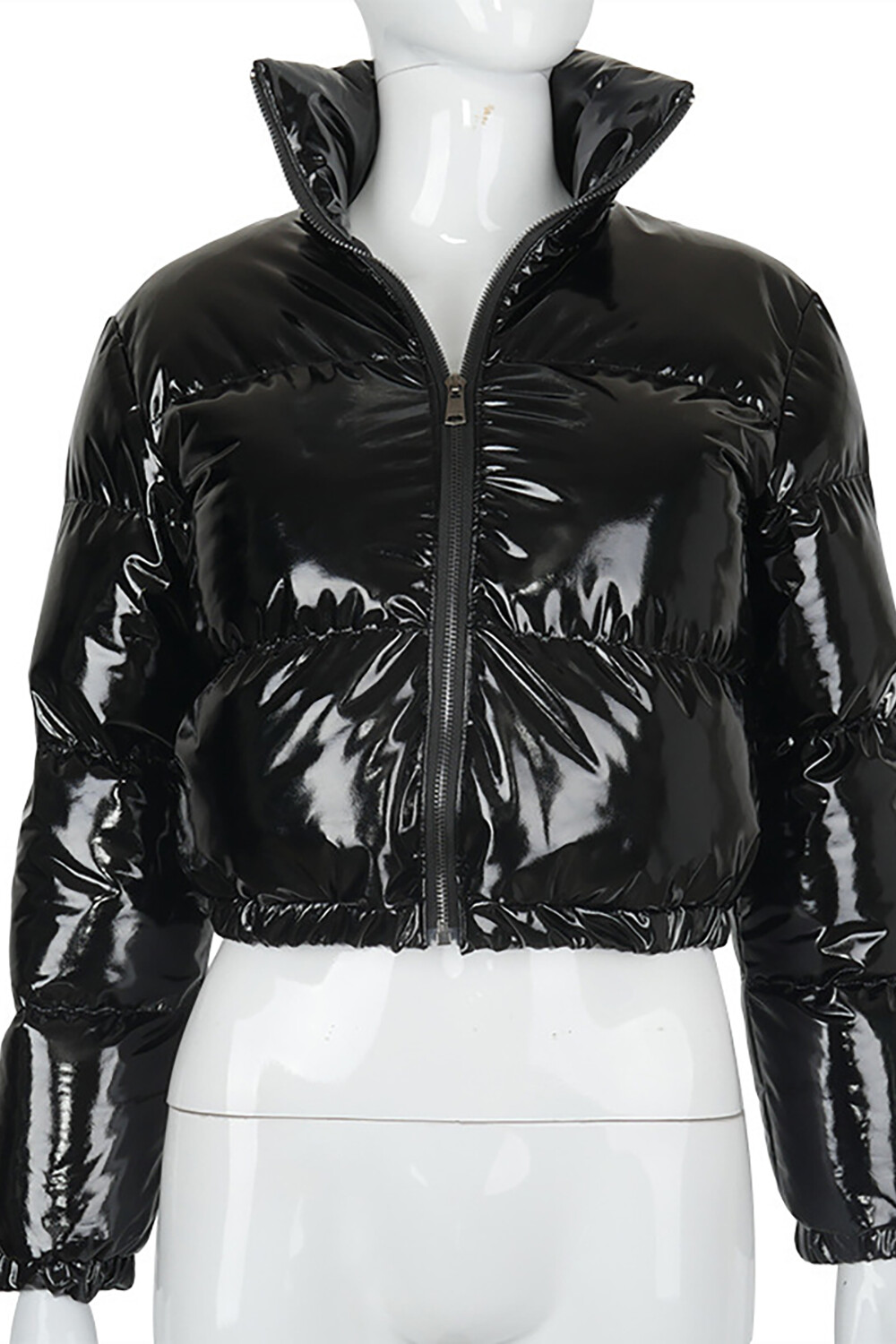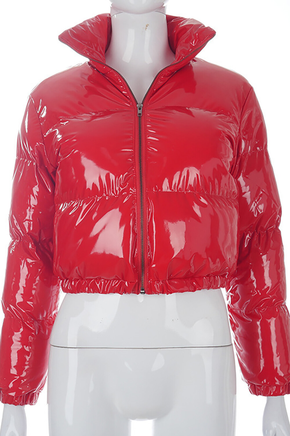 • Glossy PU Leather Turndown Collar Long Sleeve Crop Down Jacket-Red