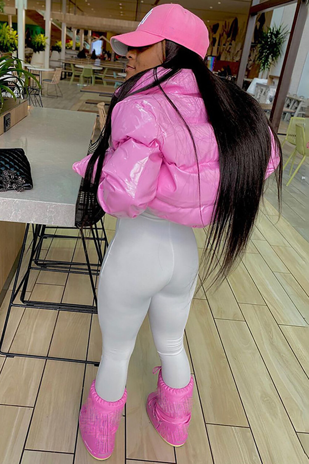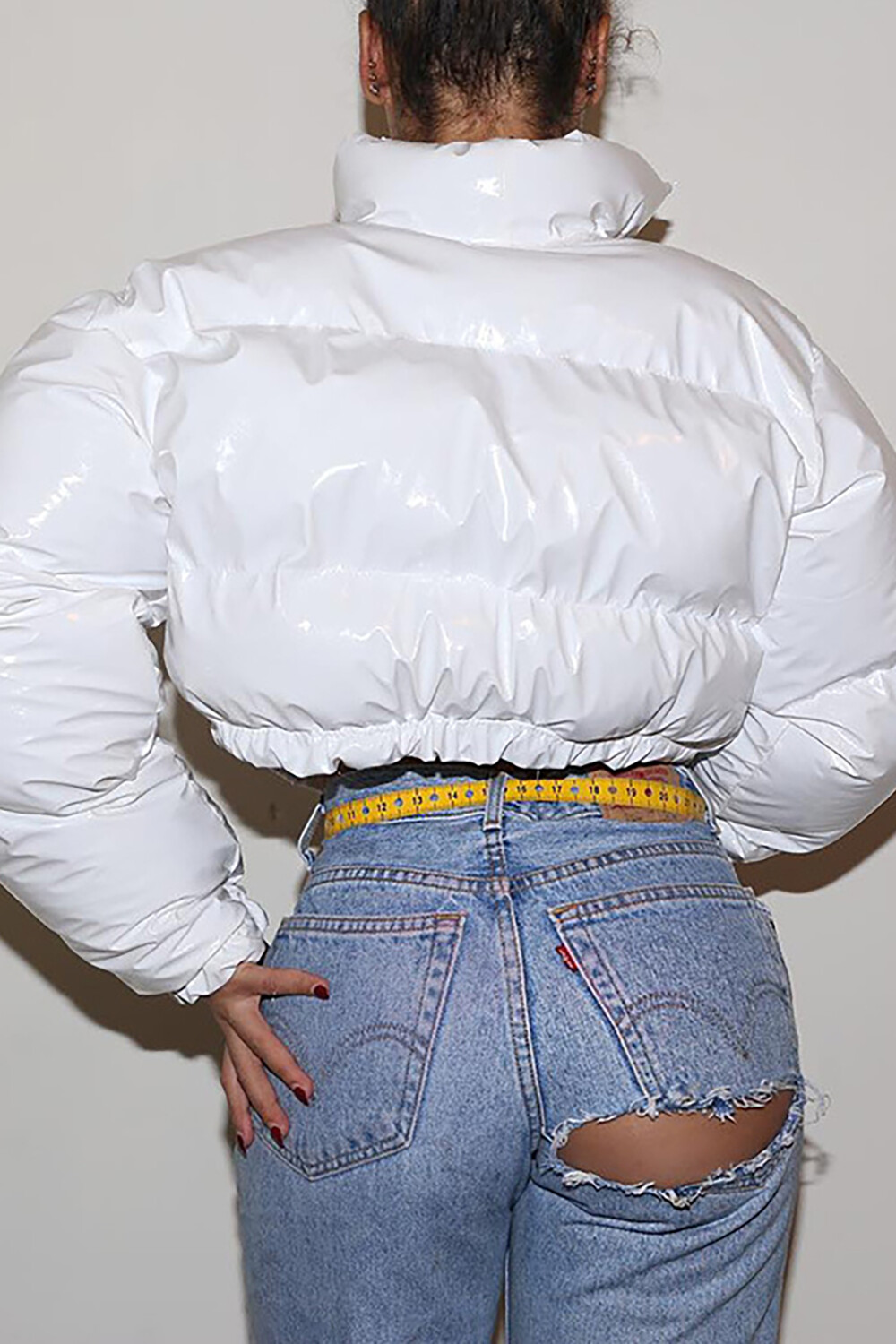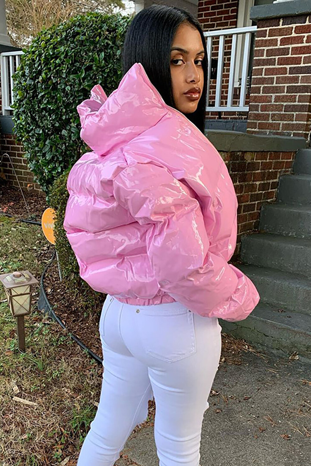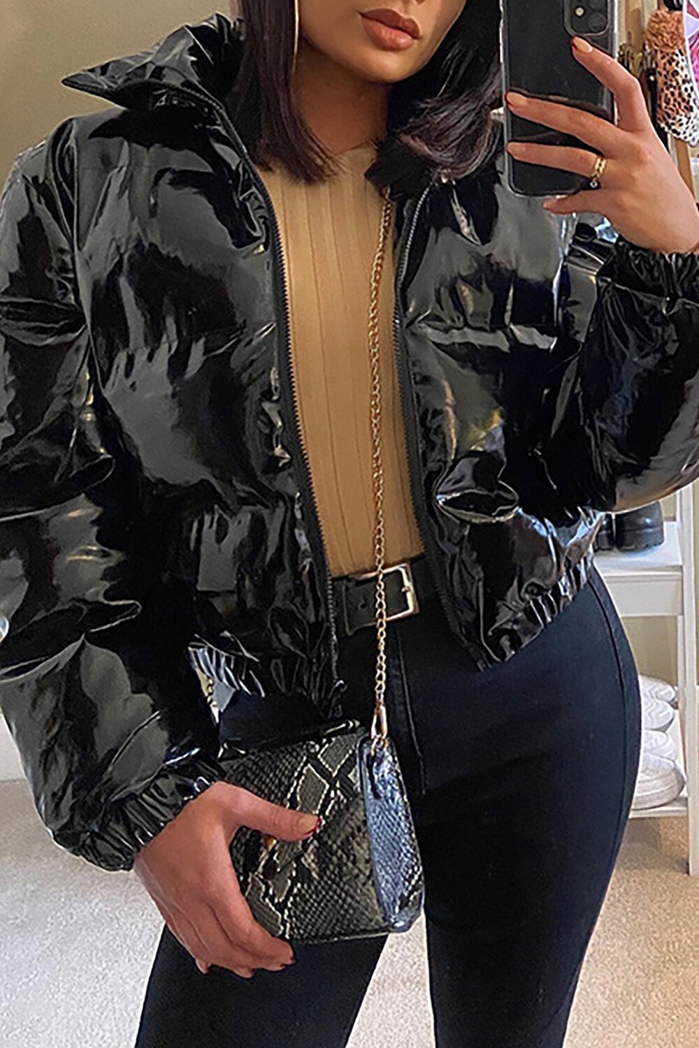 • Glossy PU Leather Turndown Collar Long Sleeve Crop Down Jacket-Red