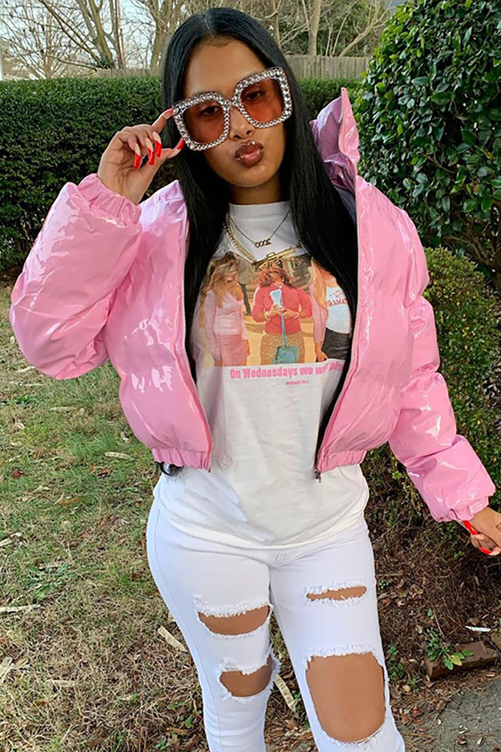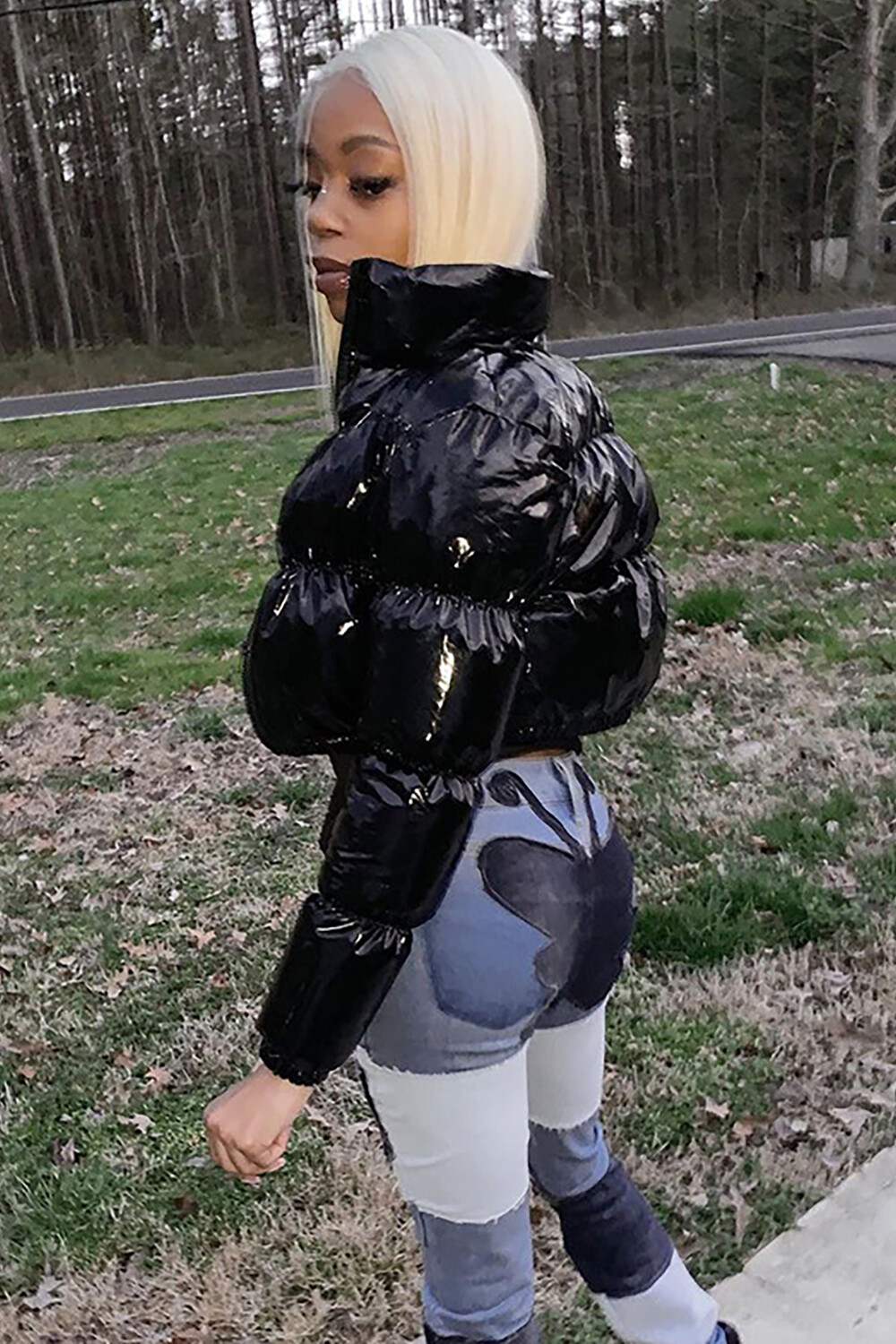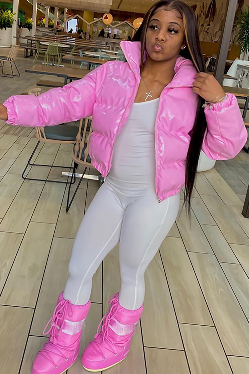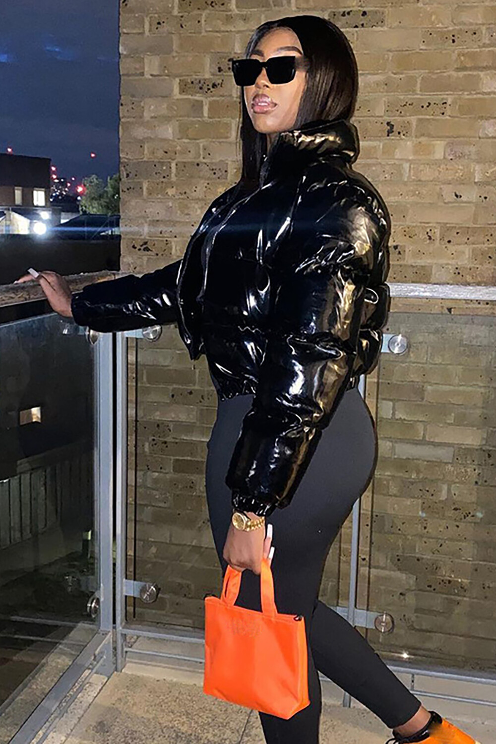 • Glossy PU Leather Turndown Collar Long Sleeve Crop Down Jacket-Red