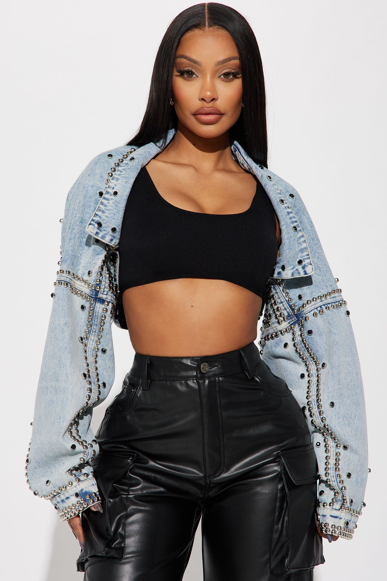 Available In Black Wash And Light Blue Wash.Bolero Denim JacketCollaredSilver-Tone Stud EmbellishmentsButtoned CuffsNon-Stretch Denim75% Cotton 25% PolyesterImported