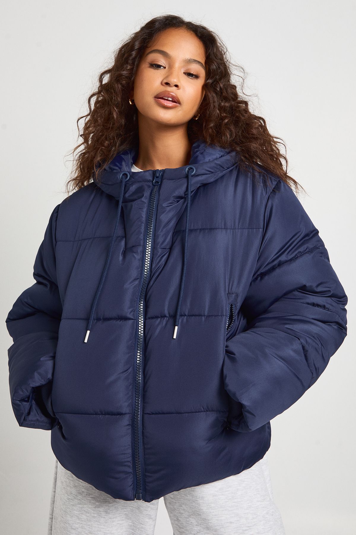 - This Hooded Padded Puffer Jacket is the ultimate casual statement piece for your winter wardrobe. The distinctive quilted design offers both style and functionality, trapping heat effectively whilst maintaining a trendy aesthetic. Style it as shown with wide-leg joggers and a simple crop top for an effortlessly cool weekend look, or pair with your favourite denim and trainers for coffee runs and casual outings. The cropped length works brilliantly with high-waisted bottoms, creating a balanced silhouette that flatters your figure. Perfect for family gatherings, shopping trips or casual meet-ups with friends, this Boohoo jacket combines practicality with street-style appeal. Add a baseball cap and chunky jewellery to complete the look, or layer over a hoodie for extra warmth when temperatures drop.