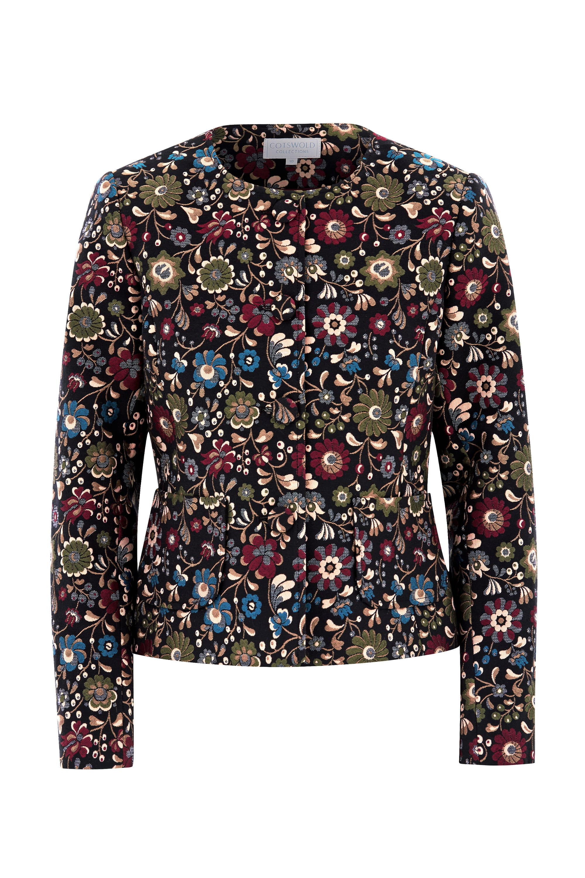 This fully lined, tailored jacket features a beautiful jacquard fabric with a rich floral tapestry effect. Gentle shaping in the body seams and chic patch pockets create a sophisticated silhouette, perfect for the seasonal months.