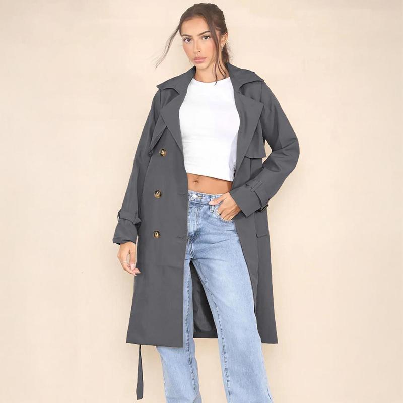 • KatchMe Women's Versatile Solid Color Notch Lapel Double Breasted Detachable Belt Trench Coat, Fall & Winter Wrap Tie Waist Outerwear Jacket, Mid-Length Trench Coat