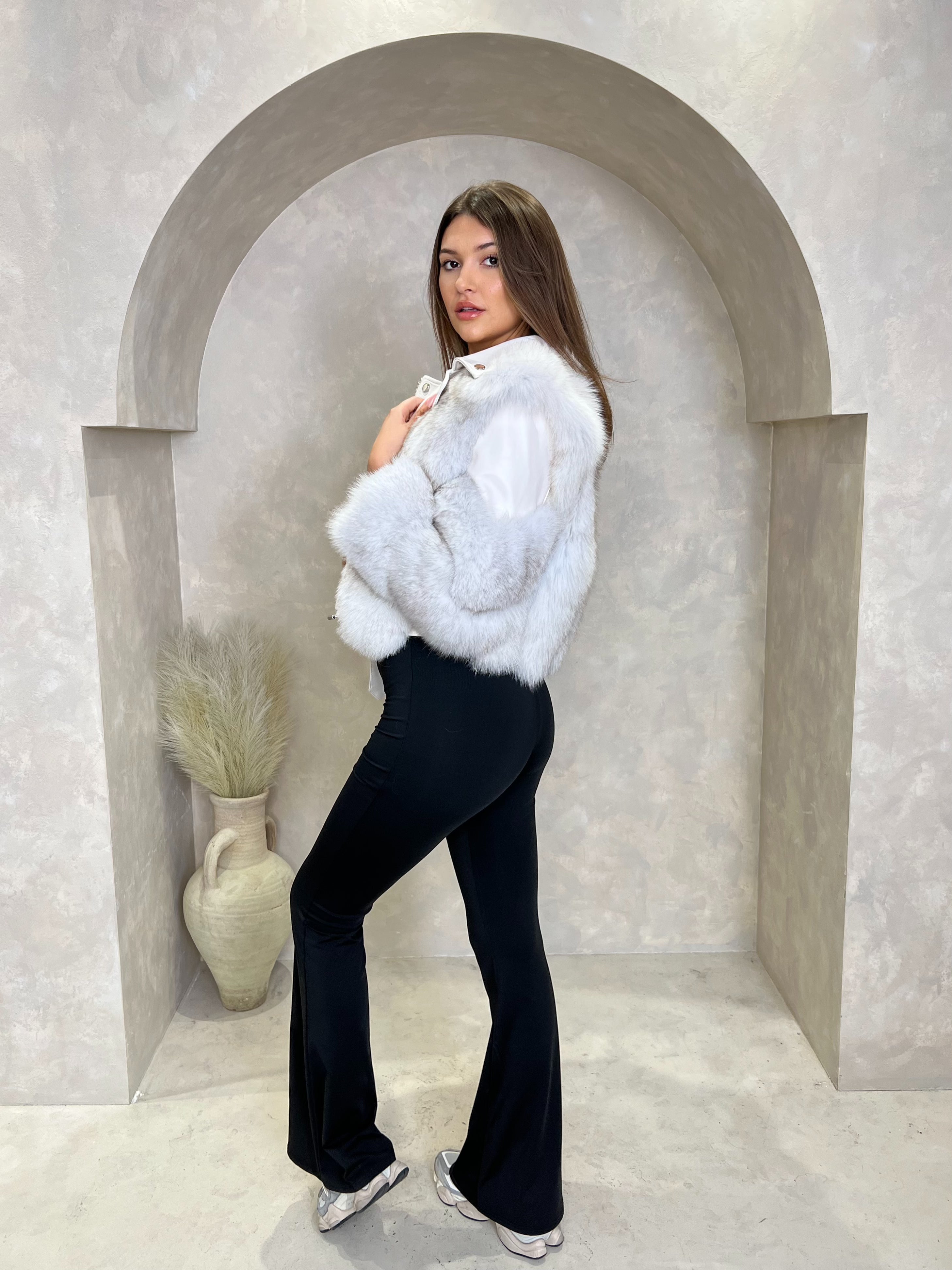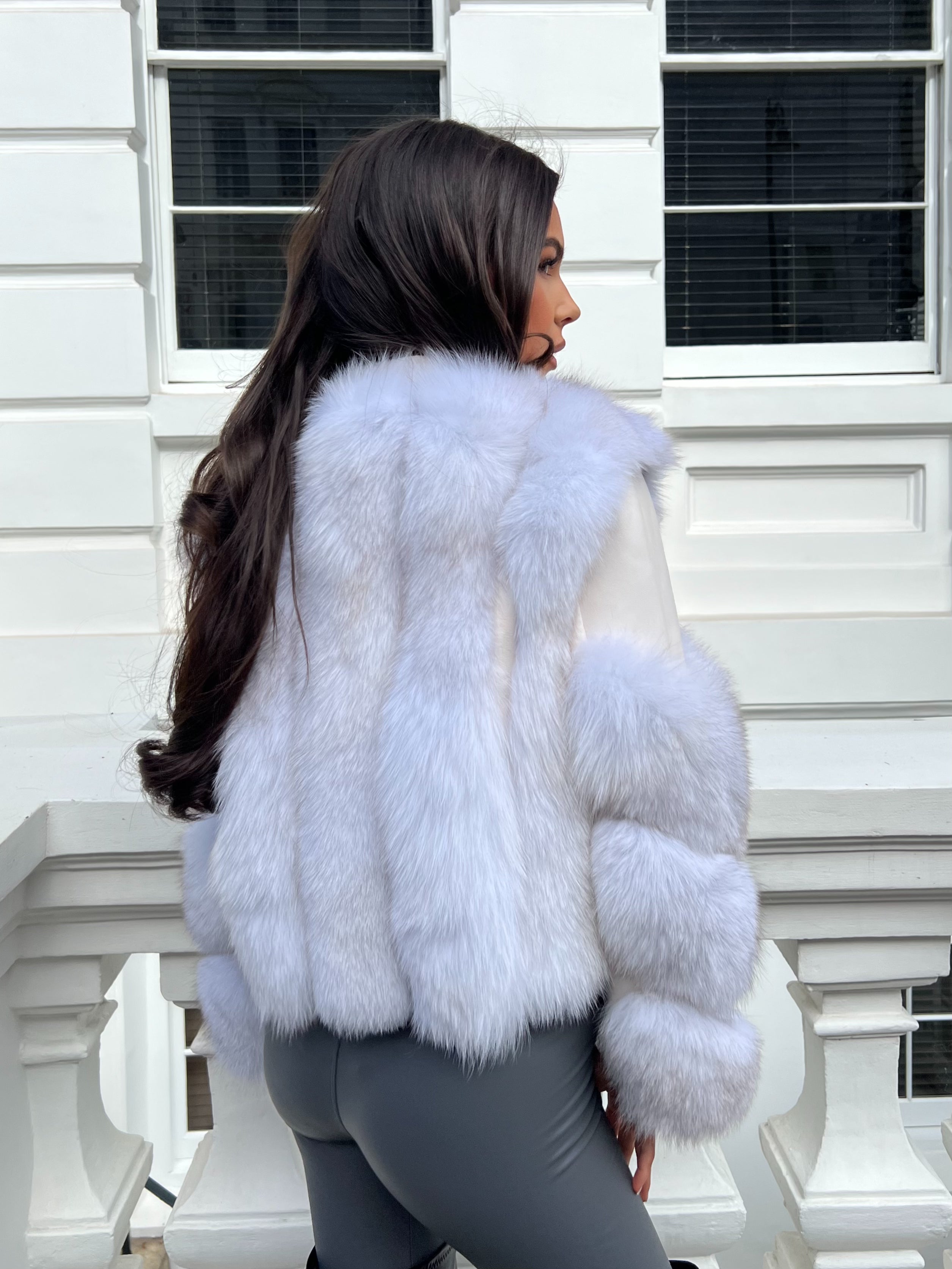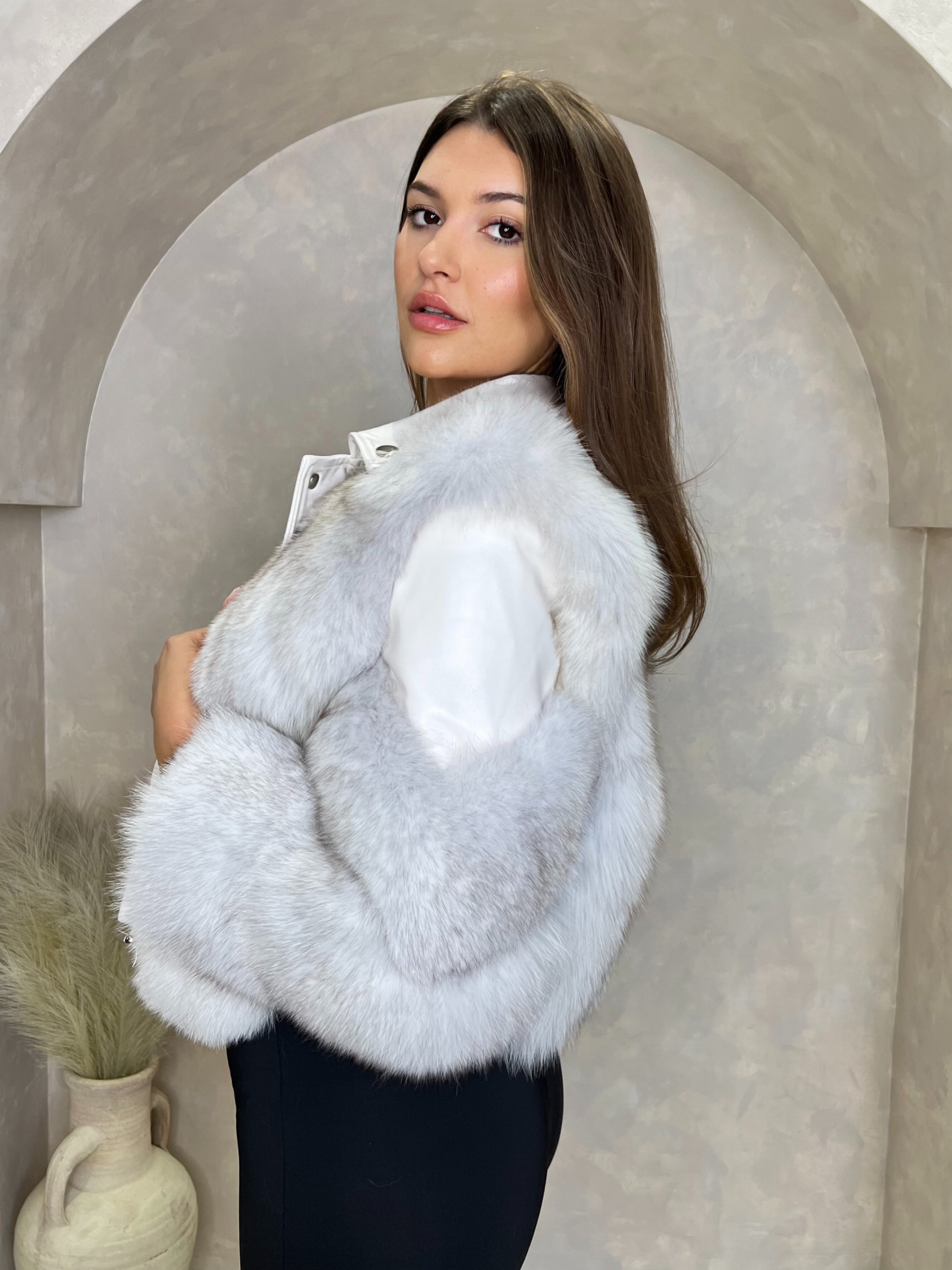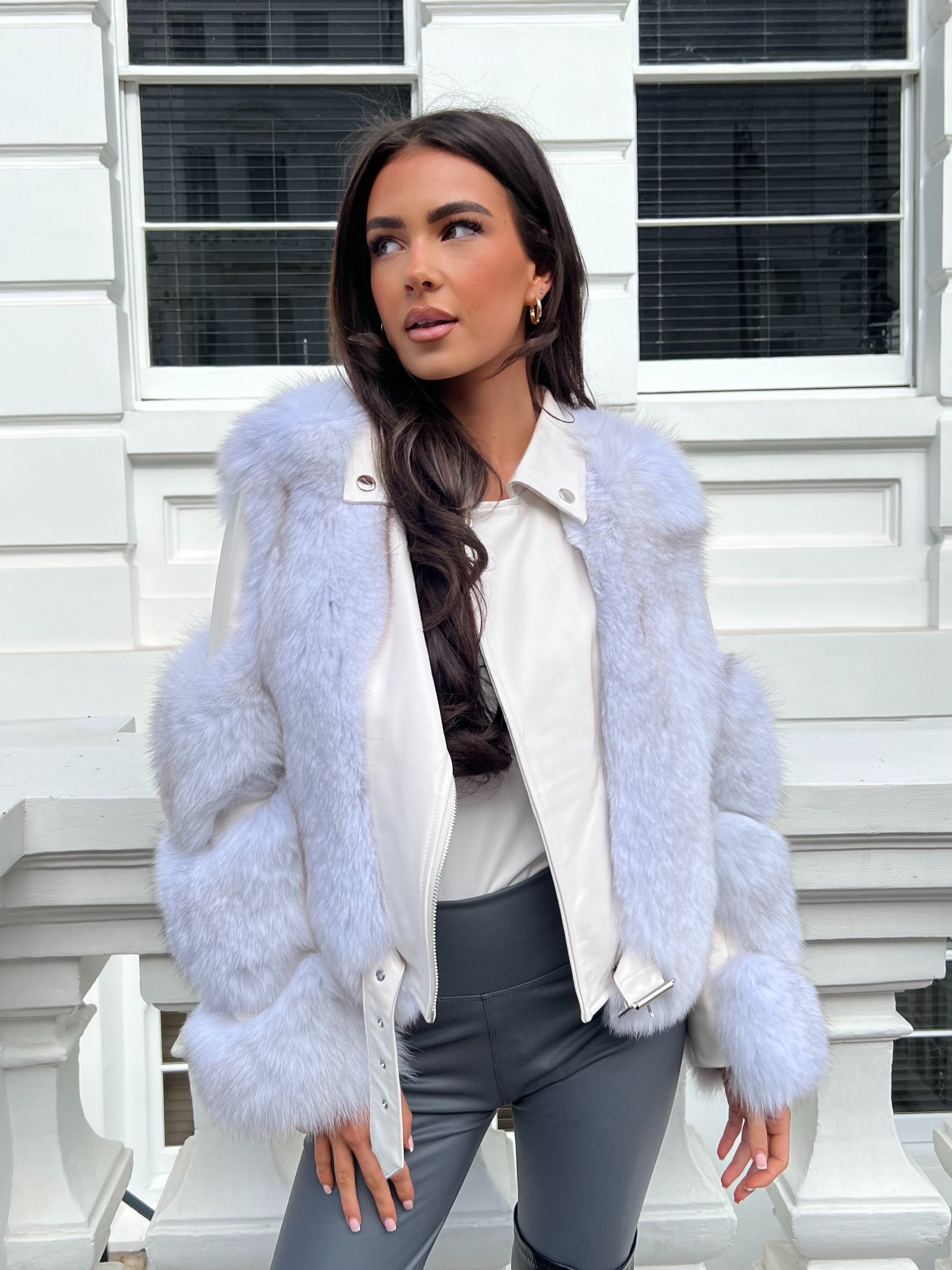Introducing our Light Grey Luxury Fur Biker Style Jacket. Made with genuine fox fur and leather, designed in a sleek biker jacket style, this jacket will keep you stylish and warm. Add a touch of luxury to your wardrobe with this must-have piece.