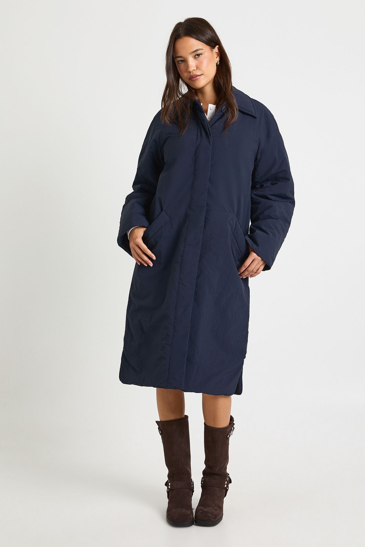 - Button-through front closure for adjustable styling Make this longline padded jacket your cold-weather essential. The generous length offers extra protection against the elements whilst maintaining a fashion-forward silhouette. Style with a cropped top and mini skirt for a balanced proportion play, or layer over jeans and a jumper for casual weekend outings. The versatile design works brilliantly with boots for a complete autumn-winter look, perfect for family gatherings or coffee catch-ups with mates. For a contemporary twist, add a baseball cap and crossbody bag as seen on our model. This jacket combines practicality with Boohoo's signature style sensibility, making it an ideal choice for the fashion-conscious woman who doesn't want to compromise on warmth when temperatures drop.