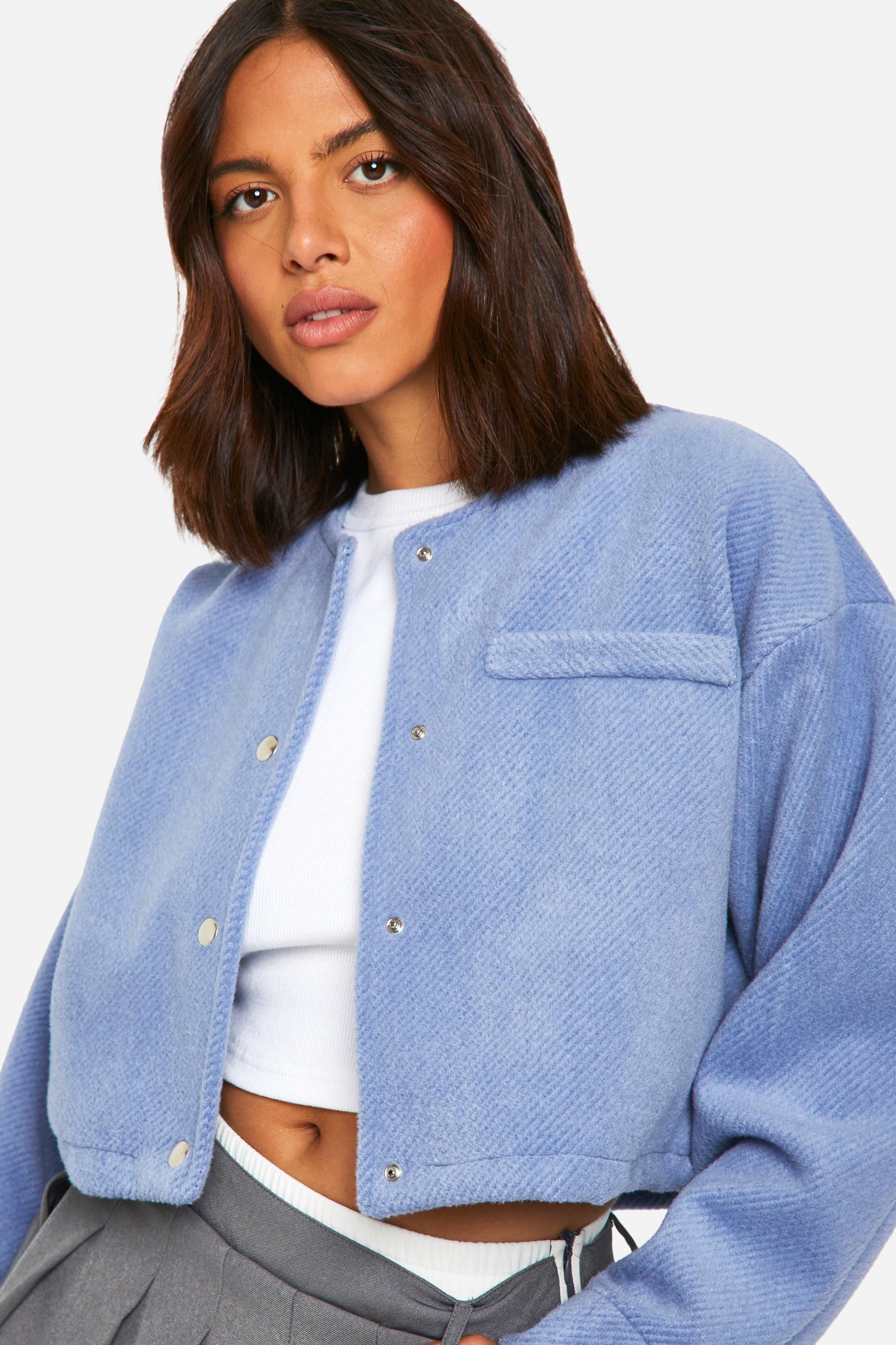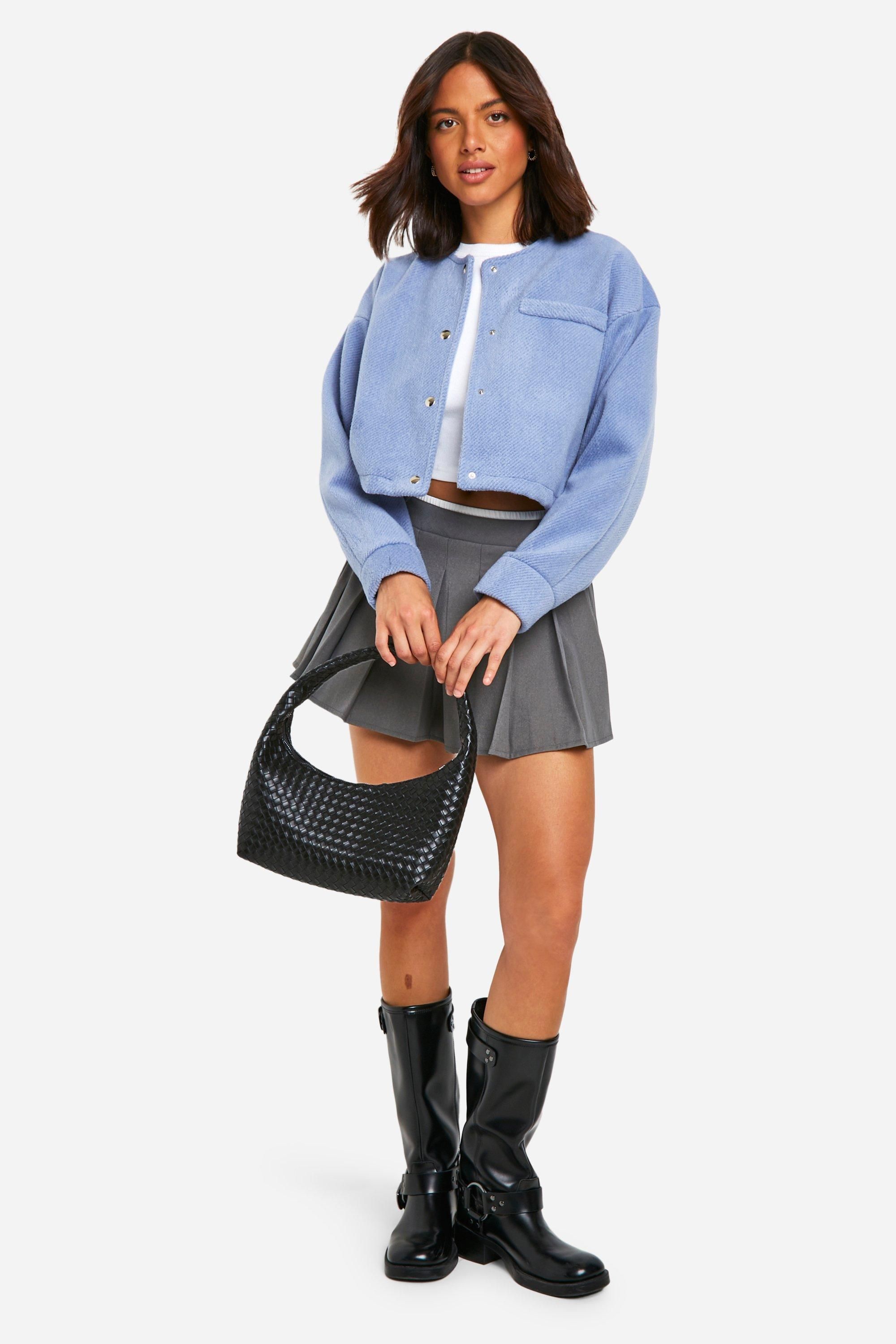 - This chic bomber jacket in a wool-like finish is the perfect addition to your casual wardrobe. Its cropped length and oversized fit make it an ideal layering piece for the fashion-forward woman. Style it with a crisp white crop top and a pleated mini skirt for a preppy-meets-street look. For a more relaxed ensemble, pair it with high-waisted jeans and trainers. The versatile nature of this jacket makes it suitable for various casual occasions, from coffee dates to weekend shopping trips. Add a touch of edge by accessorising with a sleek handbag and knee-high boots. Whether you're heading to a family gathering or a casual night out with friends, this bomber jacket will keep you looking stylish and feeling comfortable.