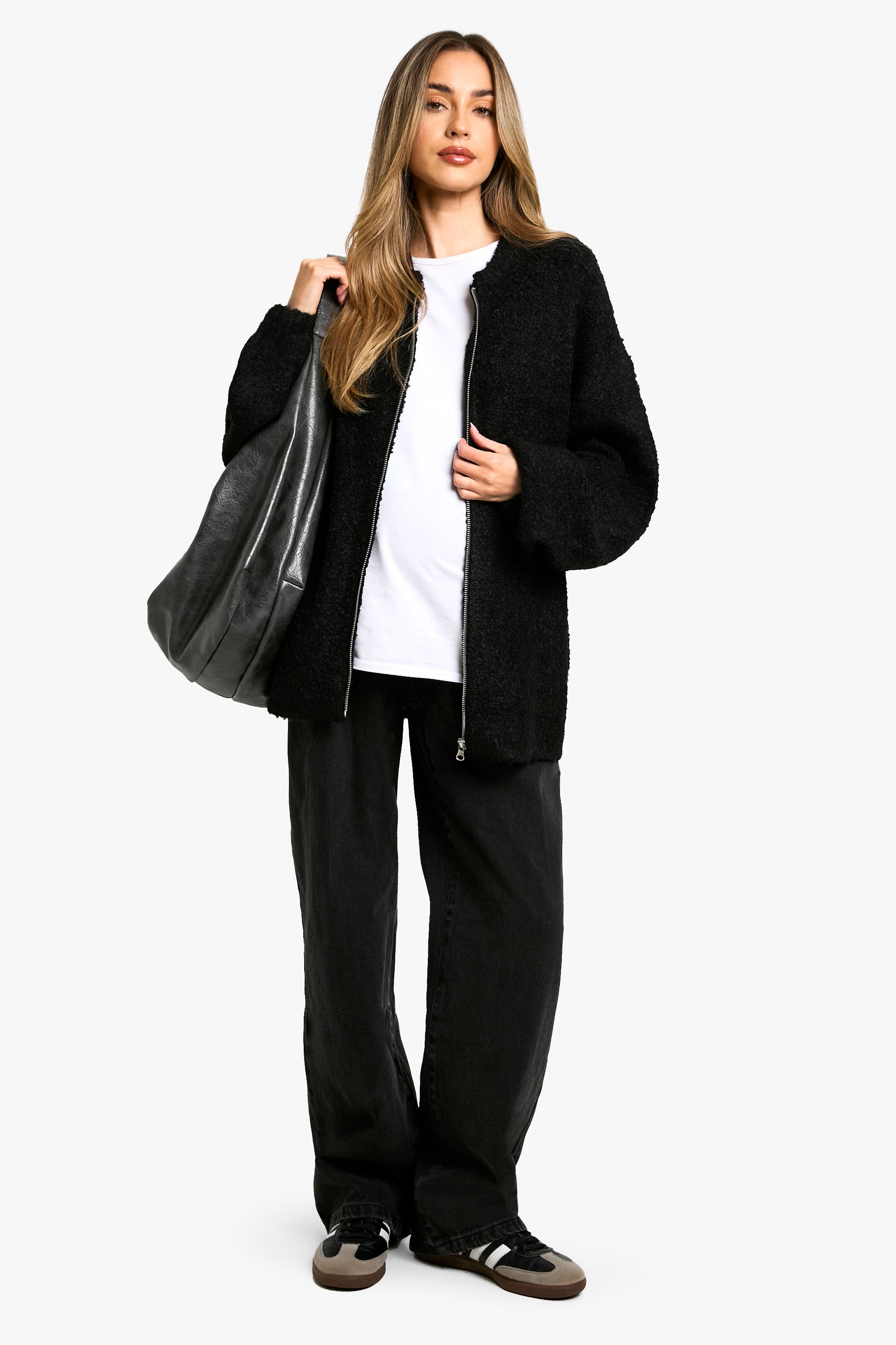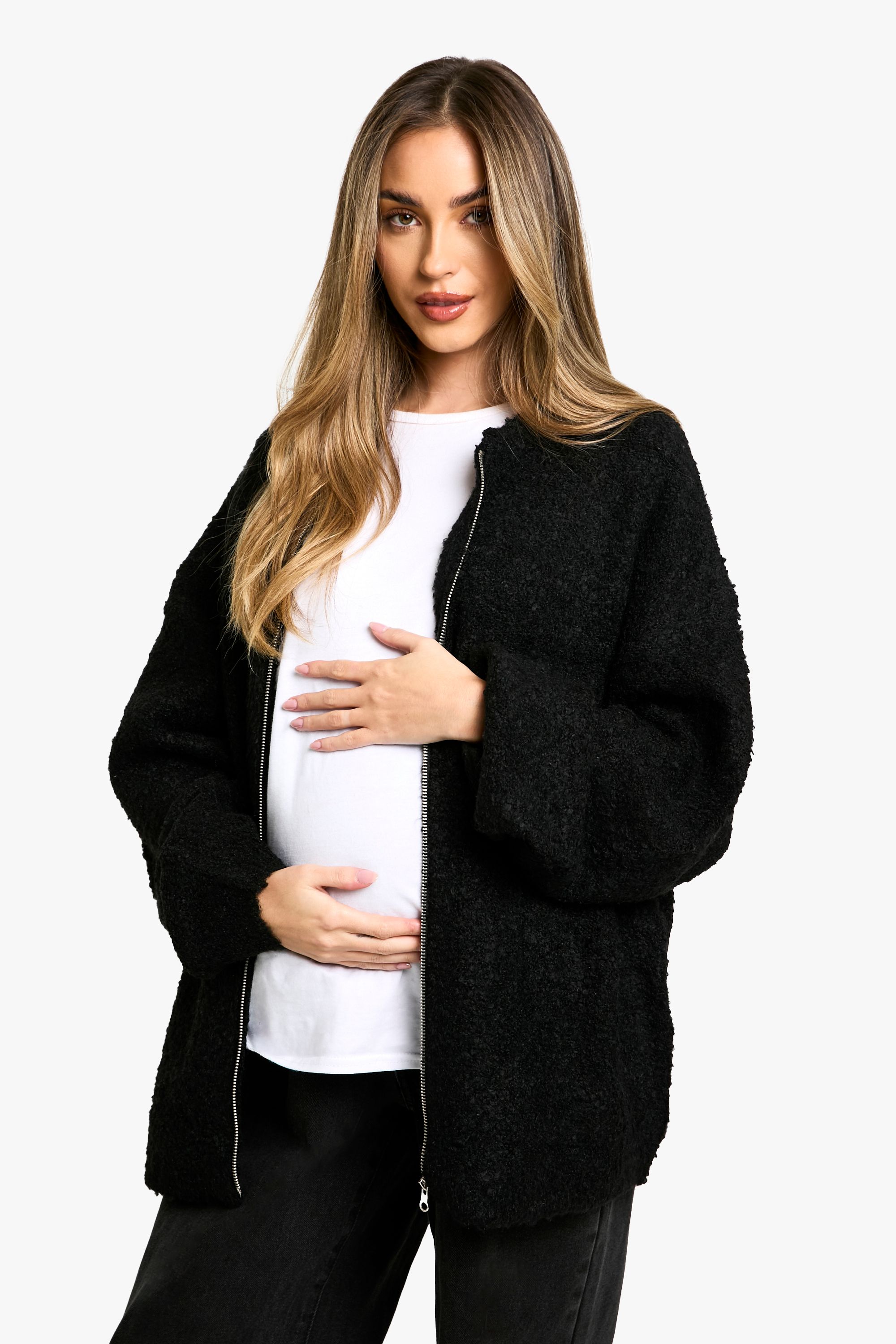 - Embrace comfort and style during your pregnancy with this chic oversized borg bomber jacket from Boohoo. The knitted texture offers a cosy feel, perfect for those chilly days when you need an extra layer of warmth. Its relaxed fit is designed to accommodate your changing shape, ensuring you stay comfortable throughout your pregnancy. Style this versatile piece with maternity leggings and trainers for a laid-back daytime look, or throw it over a midi dress and ankle boots for a more put-together ensemble. Ideal for family gatherings, casual outings, or simply lounging at home, this jacket is a must-have addition to your maternity wardrobe. The full-length zip-through closure allows for easy wear and customisable coverage, making it a practical choice for expectant mums on the go.