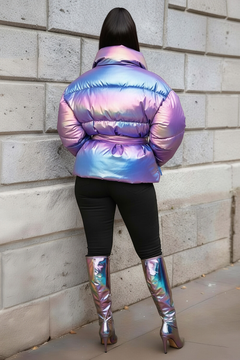 Metallic Ombre Color Overlap Collar Quilted Puffer Jacket-Purple