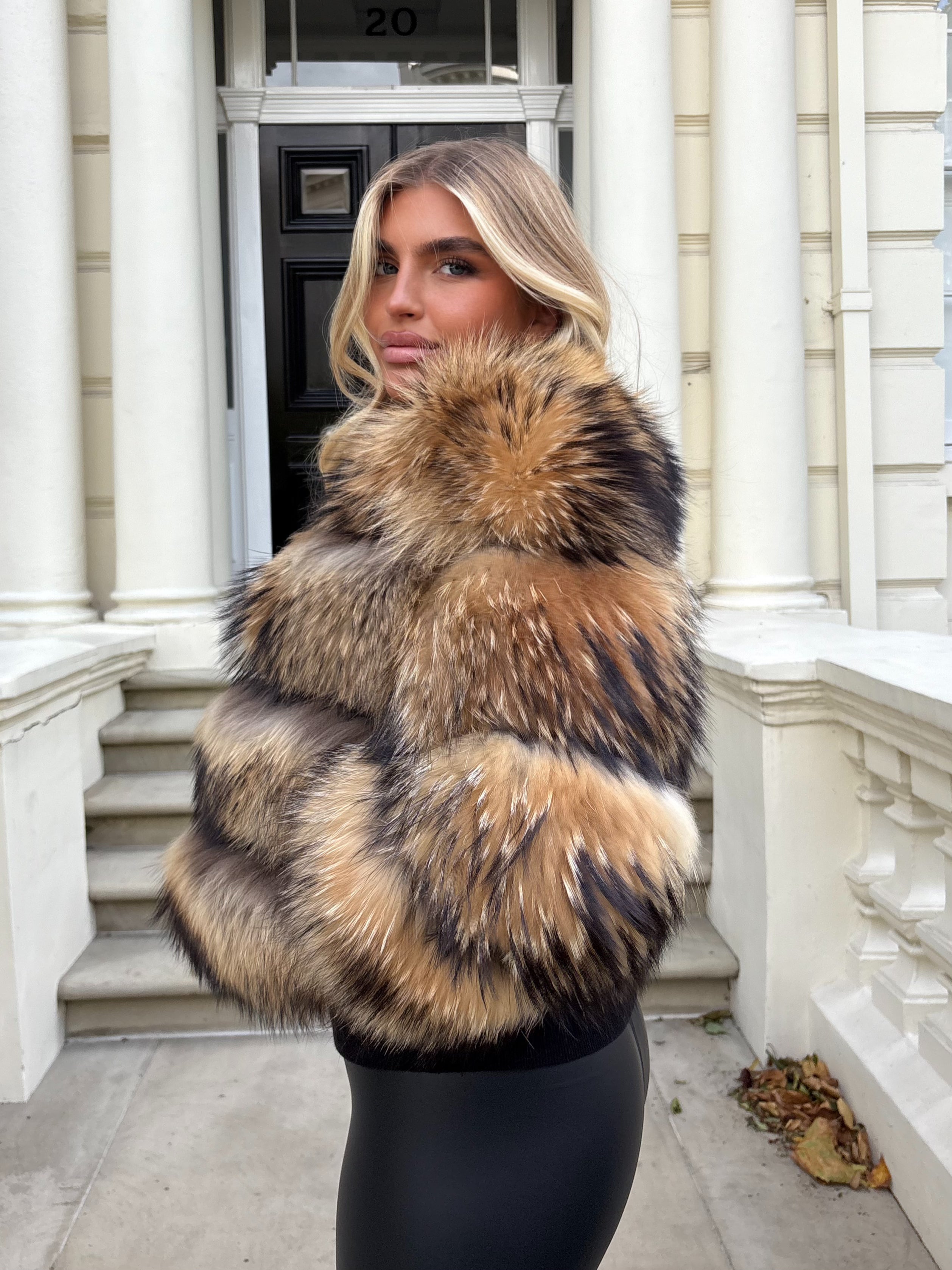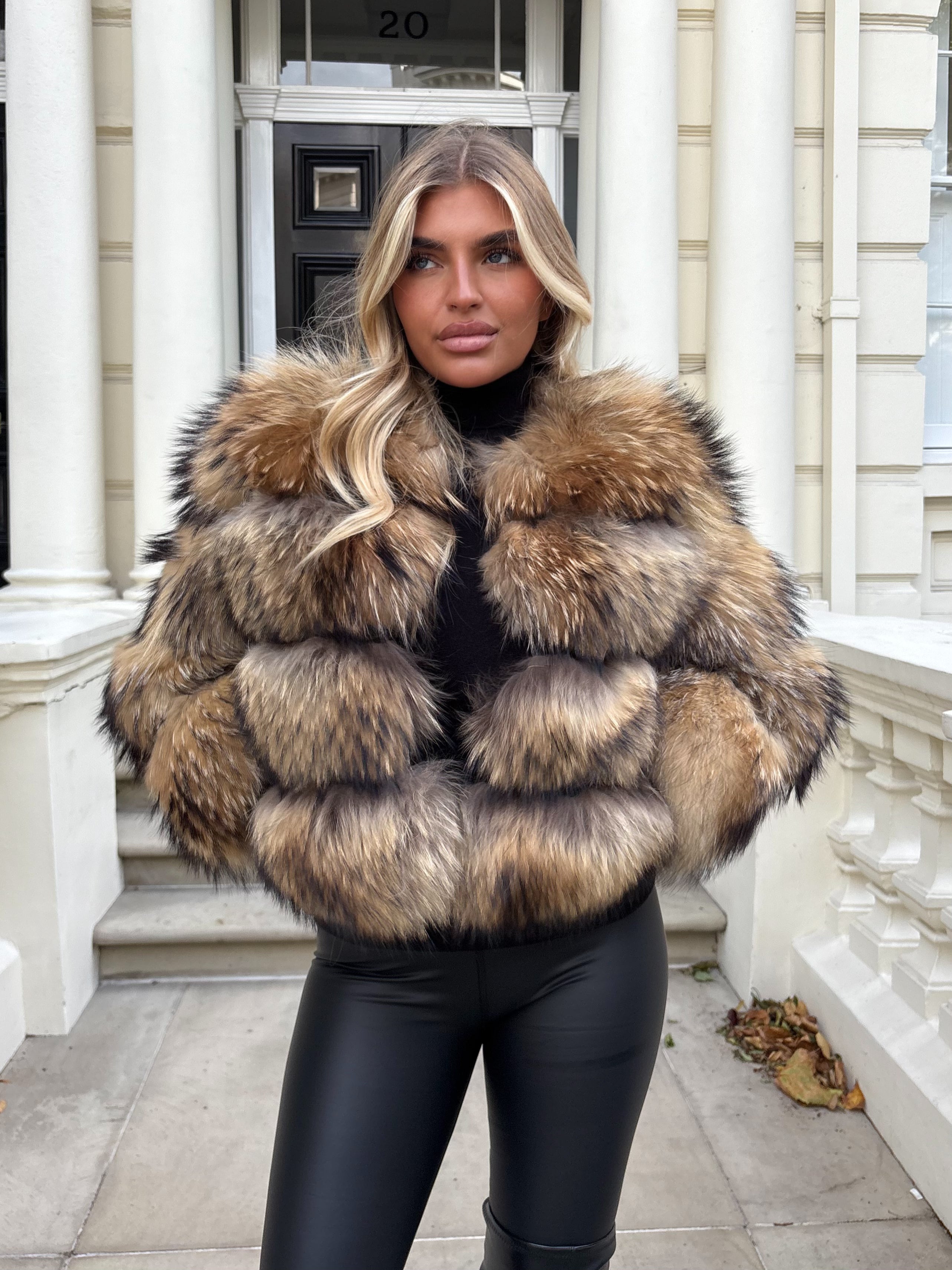 This Natural Luxury Fur jacket features a sophisticated 4-row horizontal design that enhances texture and depth. The cropped sleeves offer a modern silhouette while providing comfortable mobility. Crafted from genuine fur, the jacket combines natural elegance with warmth. A secure hook and eye fastening ensures a polished finish, making it an exceptional statement piece for refined occasions.