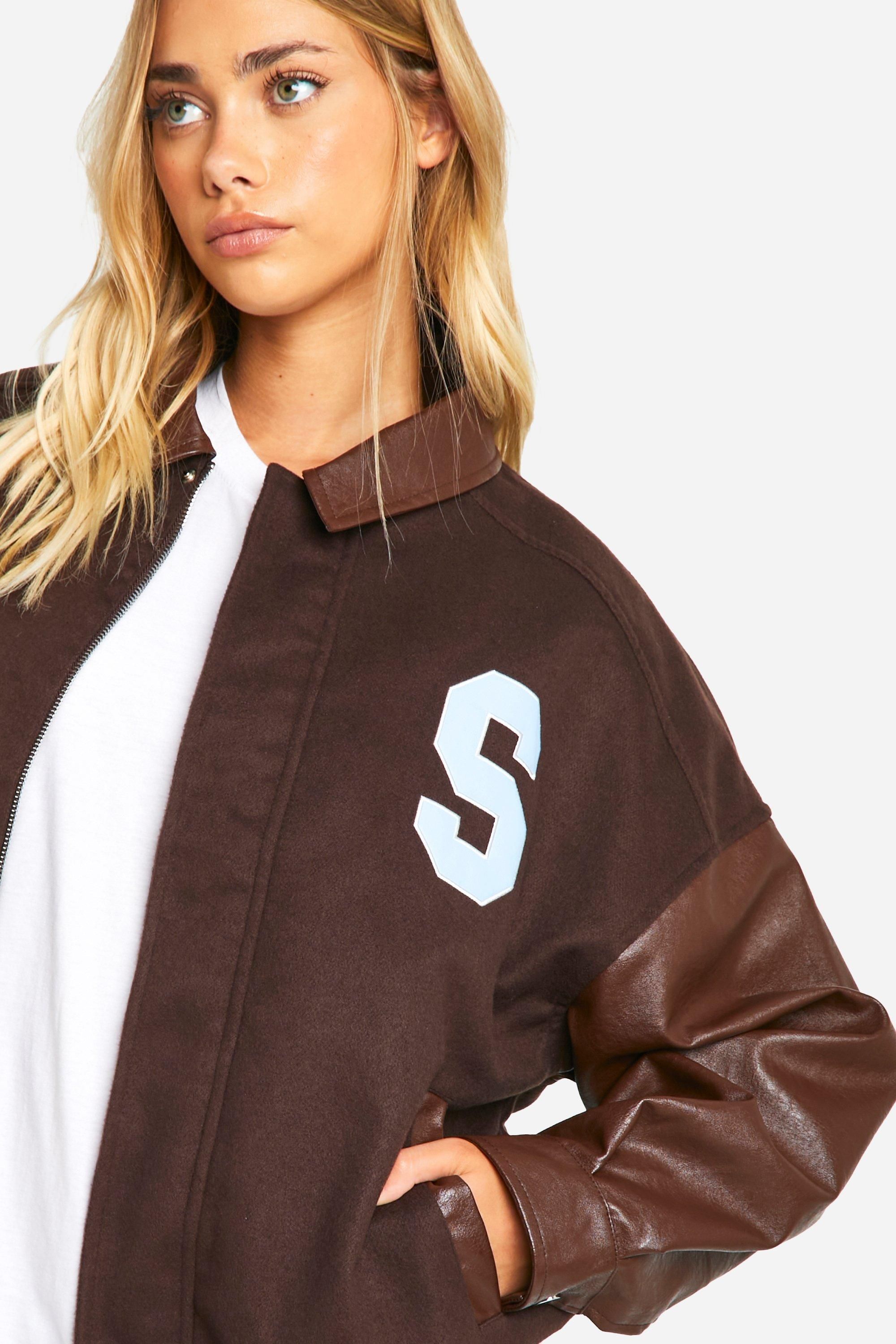 - Oversized bomber jacket with contrasting faux leather sleeves