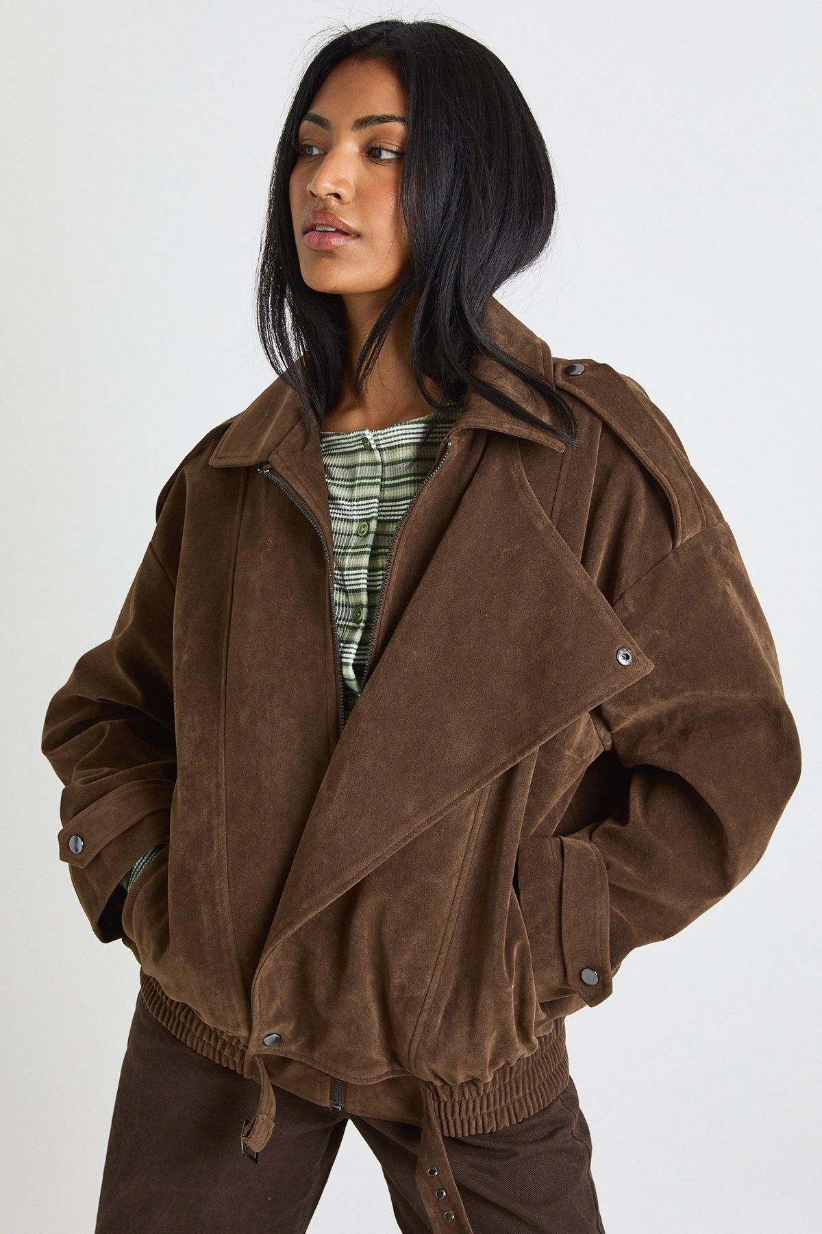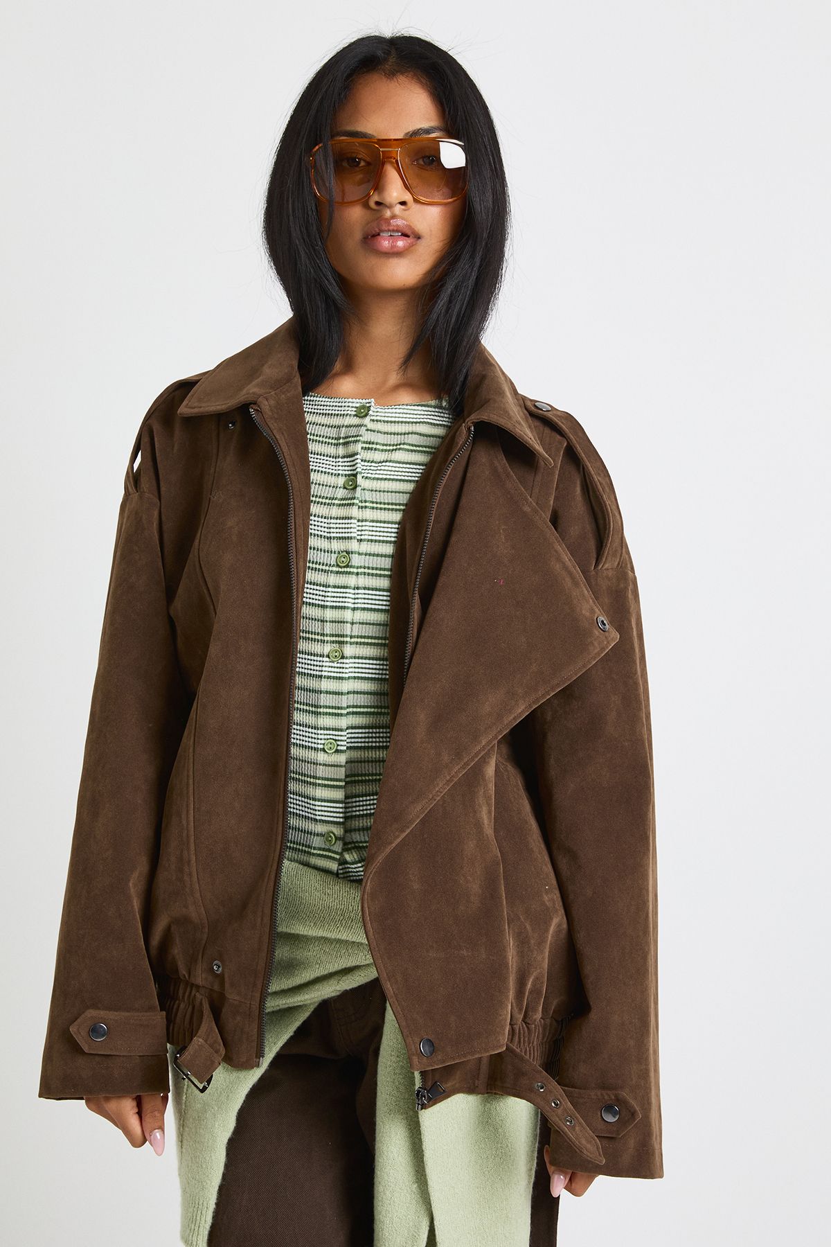 - Make a bold statement with this oversized faux suede jacket that combines relaxed styling with urban edge. The generous proportions create a fashionable silhouette that works brilliantly layered over both casual and smart-casual ensembles. Style as seen with a striped top and wide-leg trousers for a contemporary daytime look, or throw over a simple tee and jeans combo for instant weekend chic. The versatile design transitions seamlessly from coffee dates to casual gatherings, whilst the textured finish adds interest to your autumn-winter wardrobe. For cooler days, layer over a lightweight jumper and pair with chunky trainers and your favourite crossbody bag. This jacket is a true wardrobe hero that will become your go-to for effortless, on-trend styling throughout the seasons.