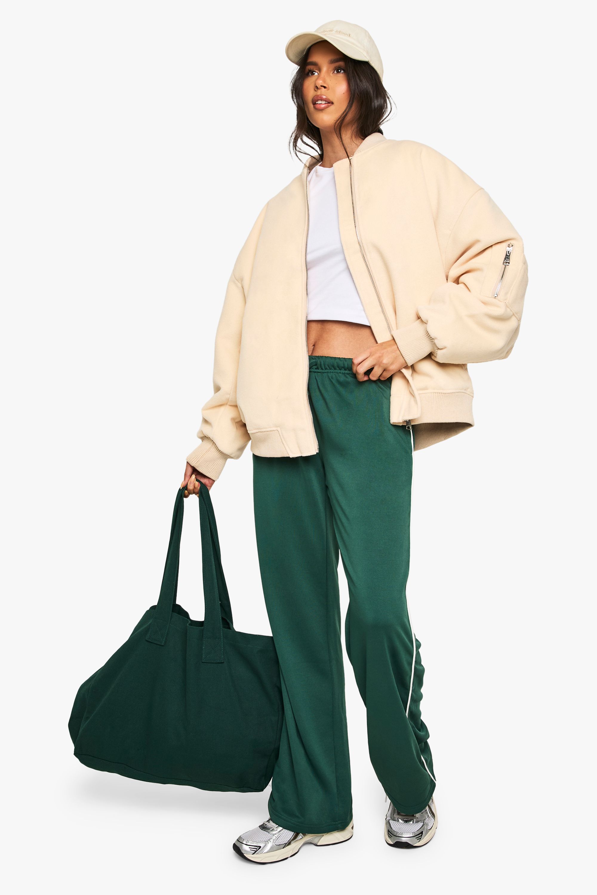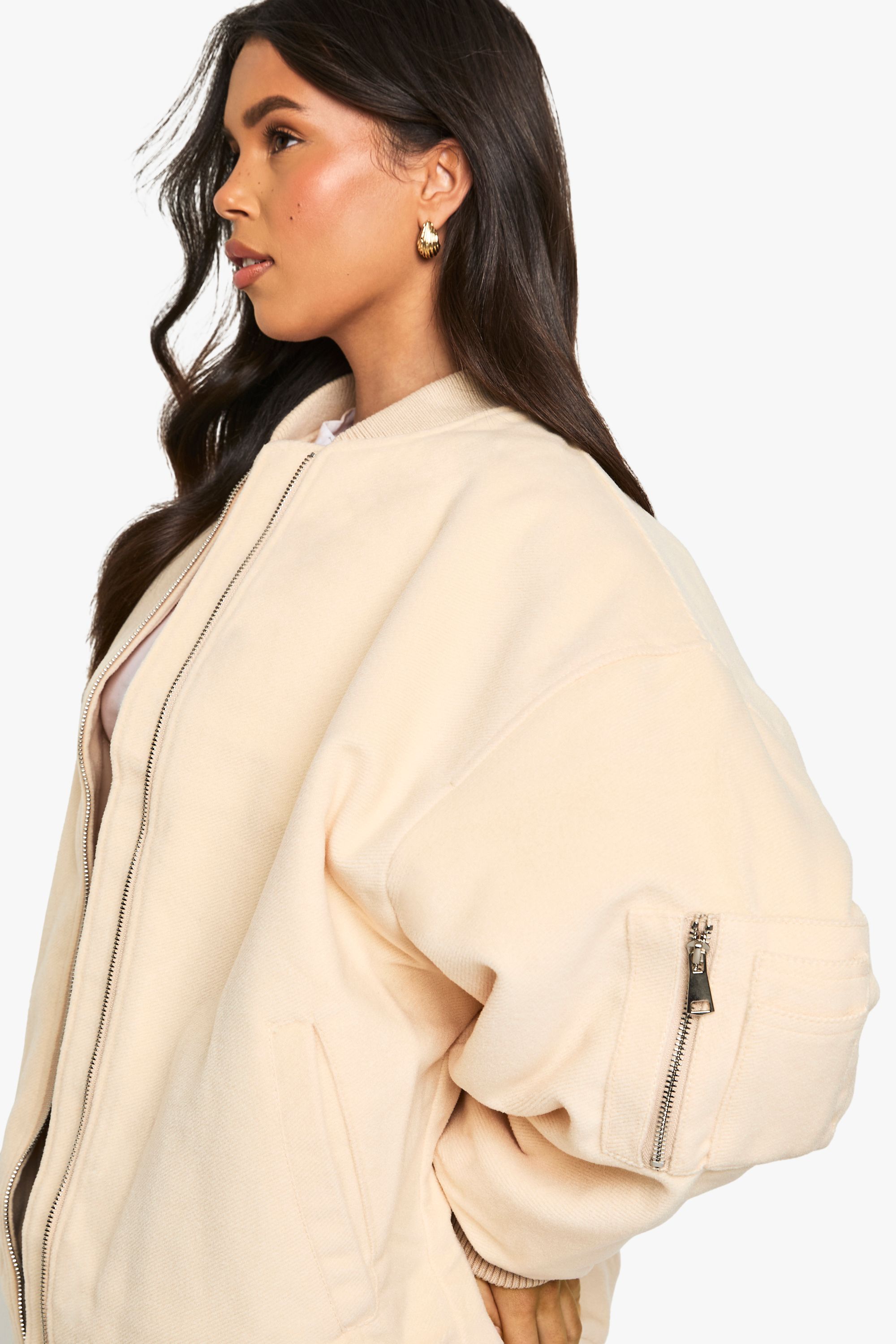 - Keep things casual but always on-trend with a piece of outerwear perfection, the bomber jacket. A light jacket featuring a gathered, ribbed waistband and matching cuffs, a bomber jacket is versatile, timeless, and the perfect way to edge up your casual wear. Wear your new women's bomber jacket with a shirt and stripe joggers for the hottest look of the moment: sports luxe, or layer a varsity jacket over a t shirt dress for a fresh new-season look.Style: Bomber JacketFabric: Wool LookSleeve Length: Long SleeveModel's height: 168cm / 5'6""